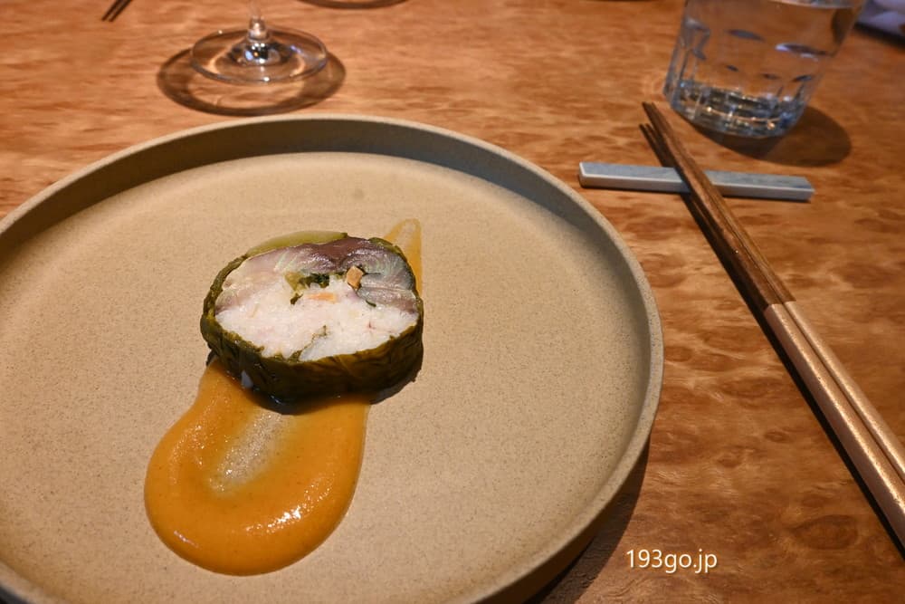 プリンセスサリー米にタイ生姜、ピーナッツ、茗荷、エシャロットを併せたシャリに、石川県産の真鯖を酢で〆て、ココナッツで燻製したものをのせ、発酵した鰹菜で巻いたもの。