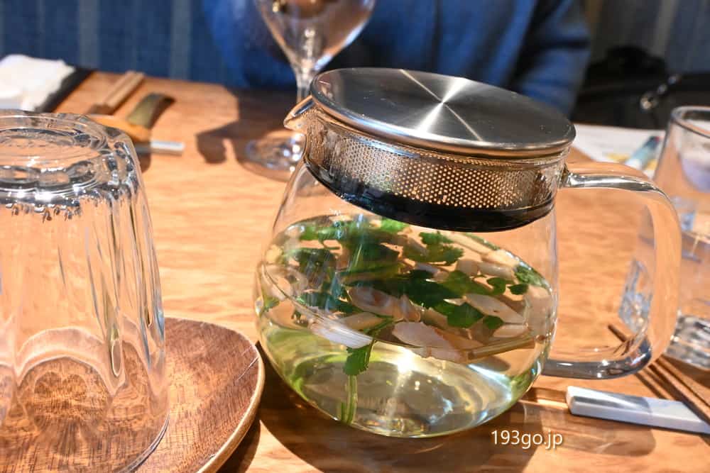 食後にいただいたハーブティーは、生姜やレモングラス、パクチー、ホーリーバジル、バイマックルなどのタイ料理に使うハーブがたっぷり。味自体は強くないのに香りにインパクトが。