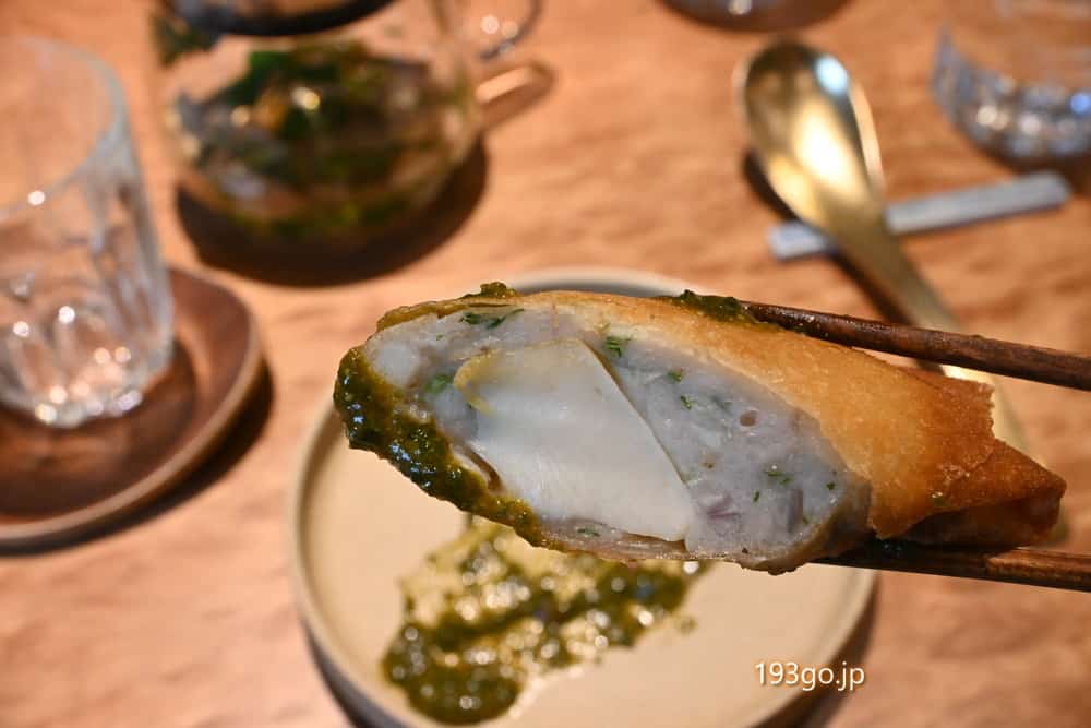 パリッとした春巻きの皮の中に、北海道産帆立のムースと鮑。