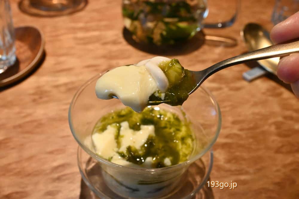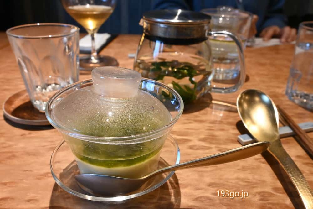 鱈の白子の入った茶碗蒸し。トムヤム ナムサイというクリアなトムヤムスープの餡に浜名湖産の新海苔を使った青海苔の層が美しい。
