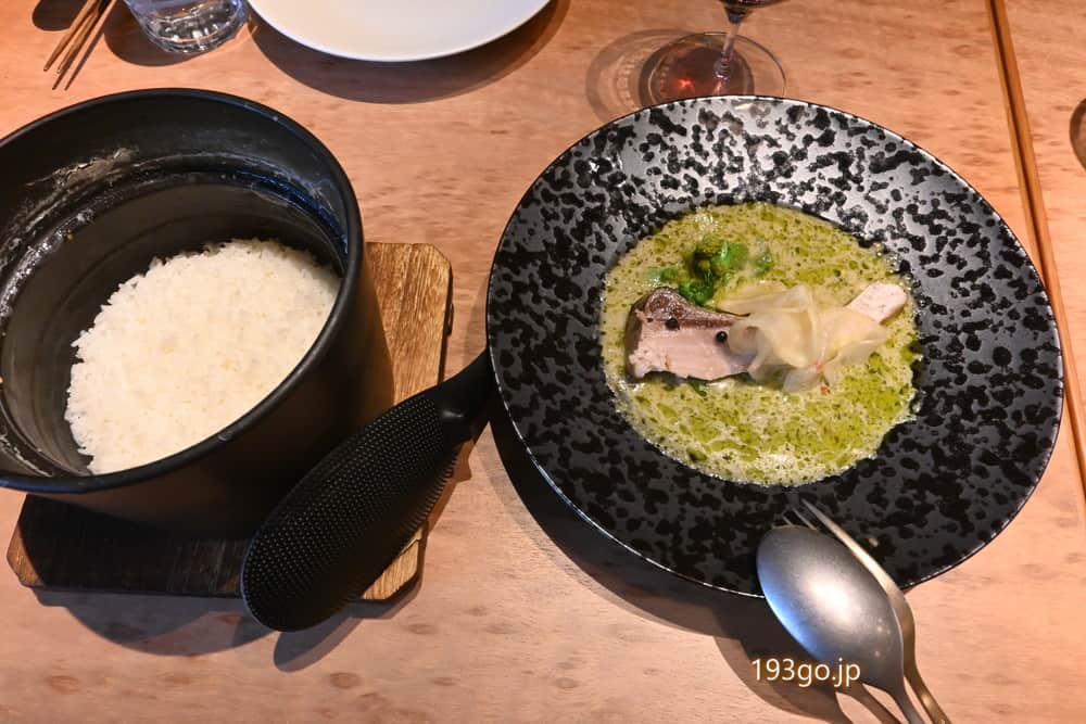 グリーンカレーの上には炭の香りをつけて焼いた富山の鰤と、勝浦農園のイタリアの菜の花パクチーソースに漬け込んだ練馬大根。