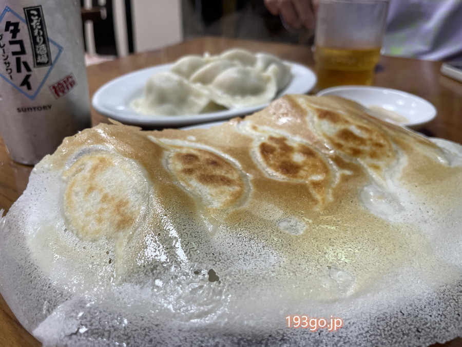 羽根付き餃子はパリッパリの香ばしい焼き目にモチモチの皮だ。