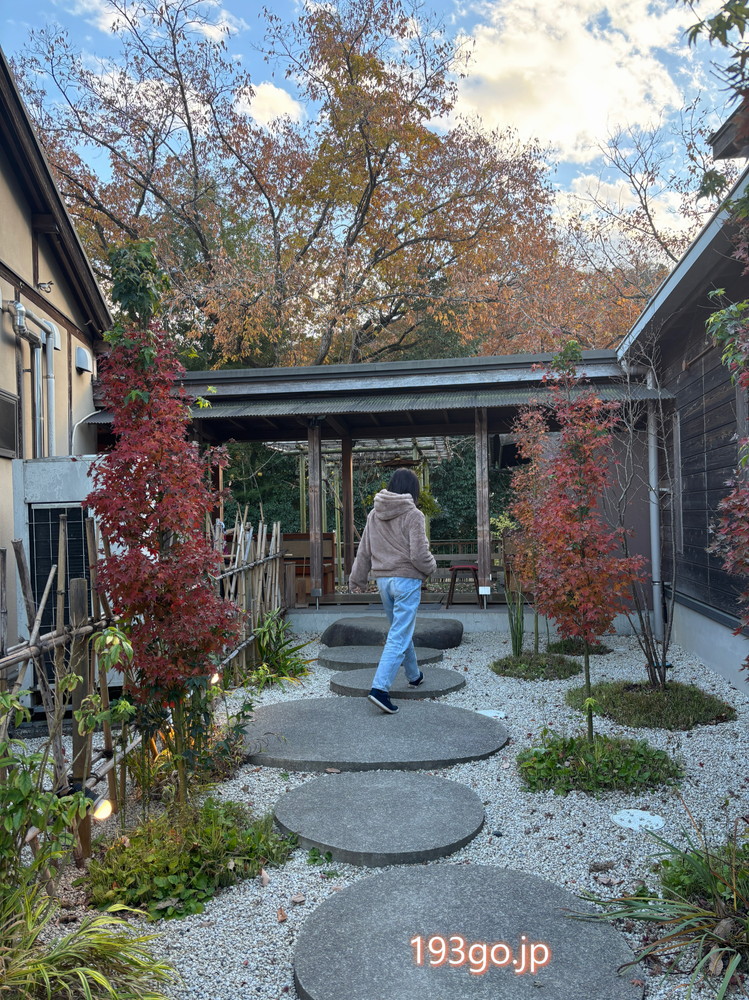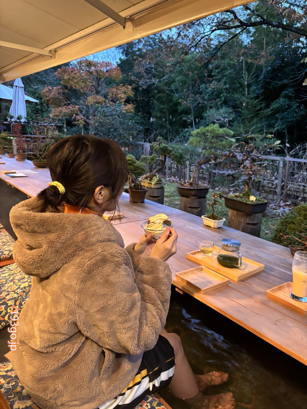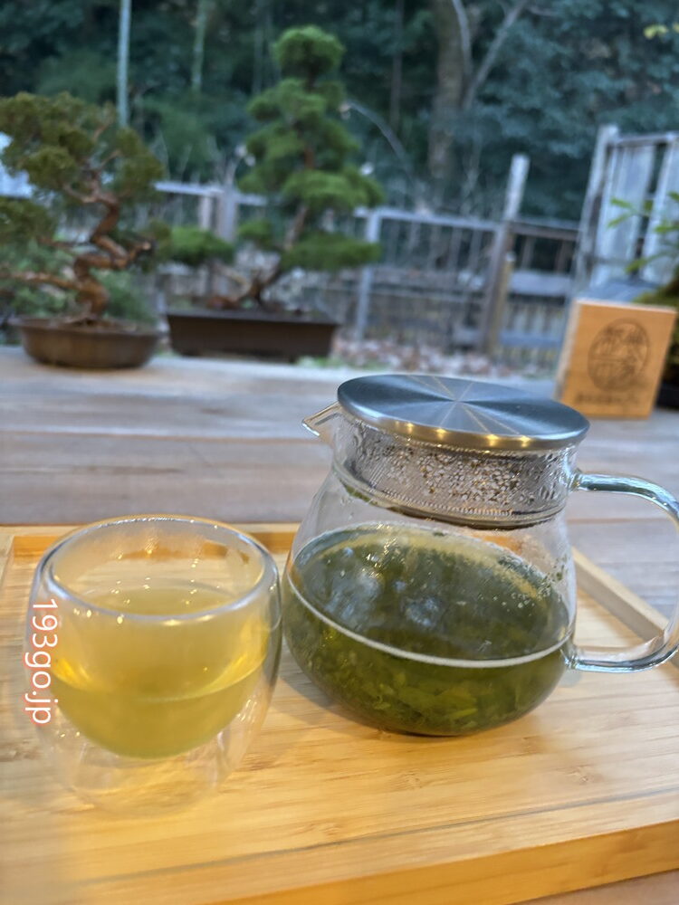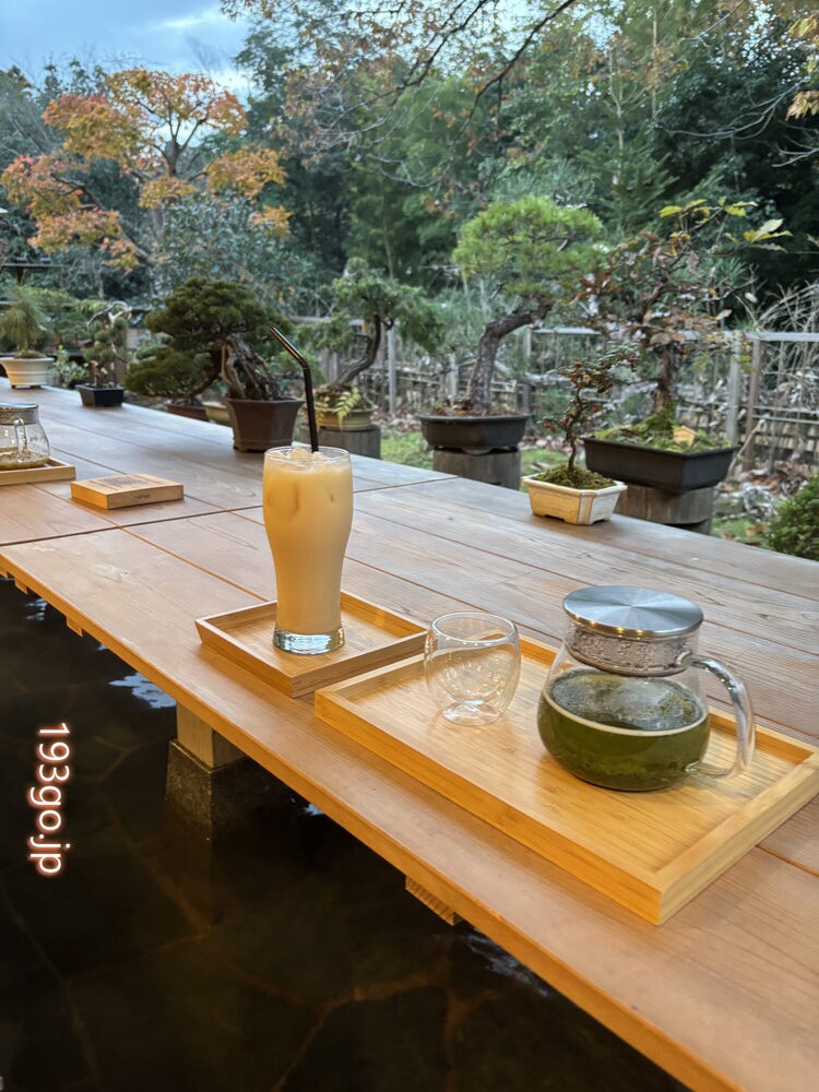 古民家の空間も落ち着くけど、盆栽が飾られた「巡る足湯カフェ」でいただくことに。