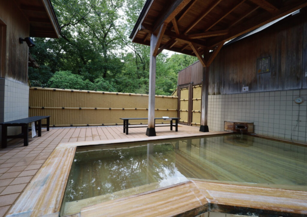 ぬるりとした滑らかな湯ざわり。 三波渓谷の緑に包まれ、爽やかな湯浴み。