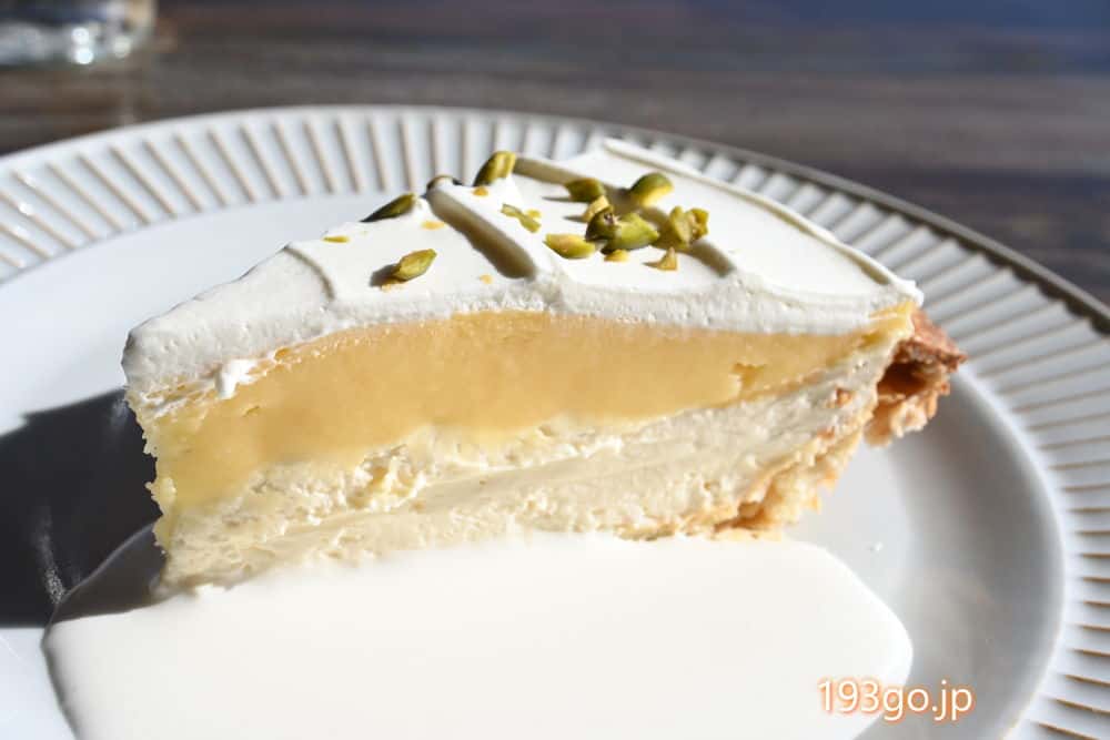 爽やかな層のレモンパイは酸味と甘さが絶妙。クリームと共になめらかなくちどけ。ピスタチオのトッピング。
