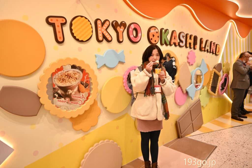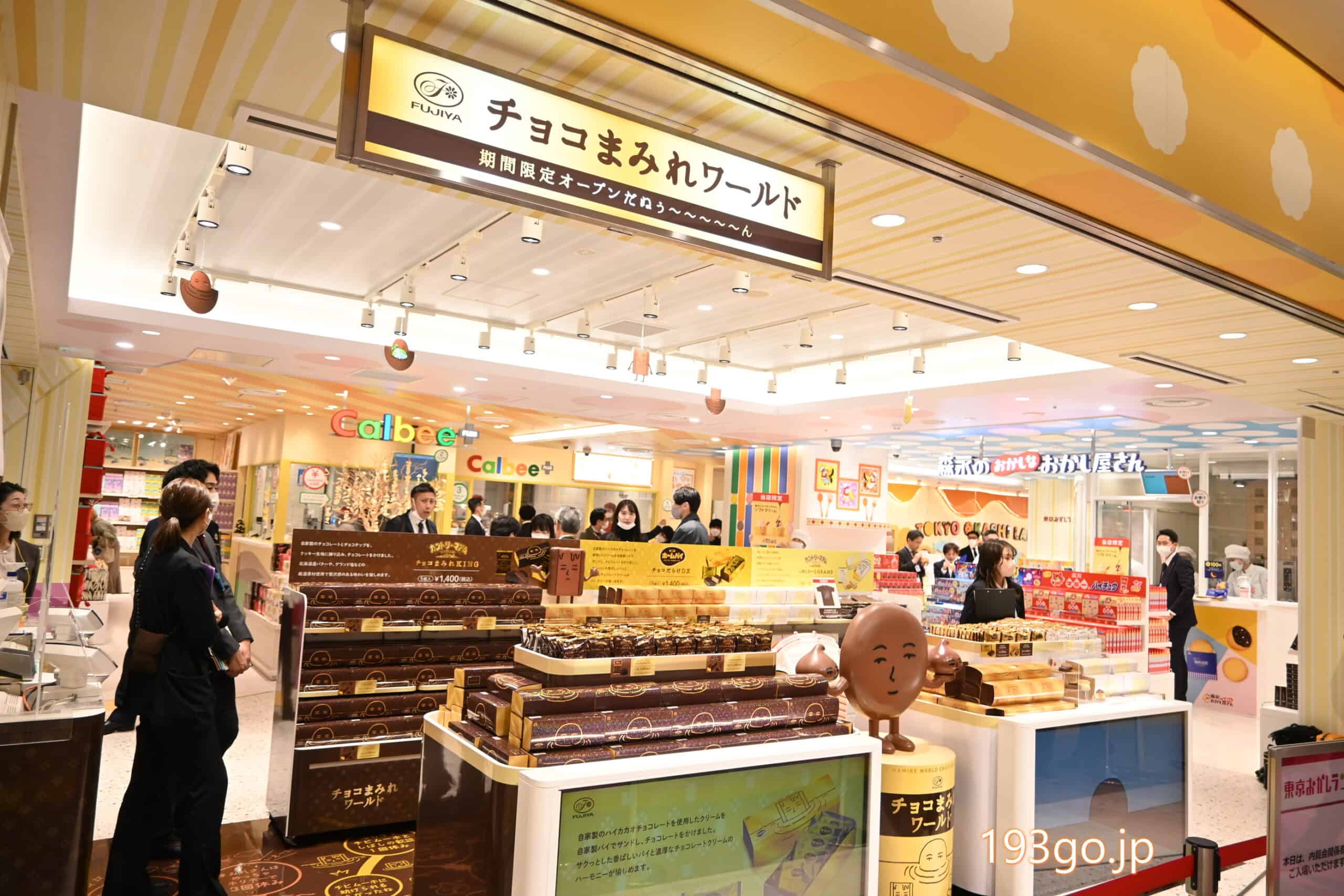 不二家の人気商品「カントリーマアム」や、「ホームパイ」がチョコレートコーティングされた東京おかしランド限定商品が楽しめる。