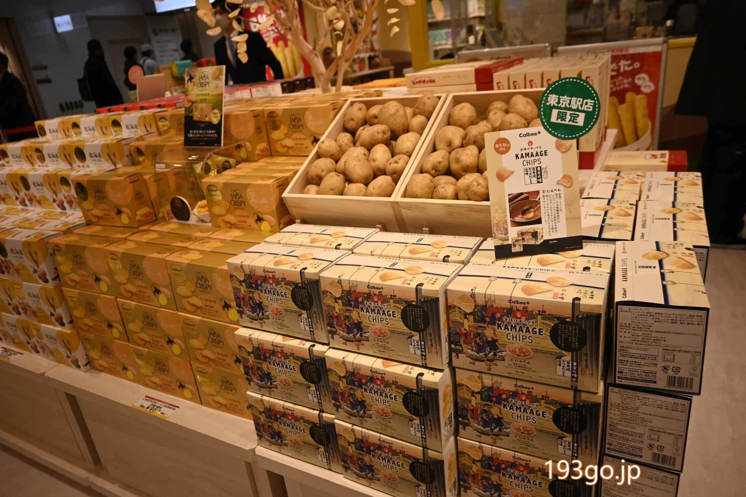物販商品は、カルビープラス限定のじゃがいも素材にこだわったプレミアムな商品に加え、東京駅店限定の「釜揚げチップス日本橋かつおだしと塩味」や、地域の味の「じゃがりこ」を詰め合わせできる東京駅店限定デザインBOXなど、カルビープラスらしい東京土産もそろえている。