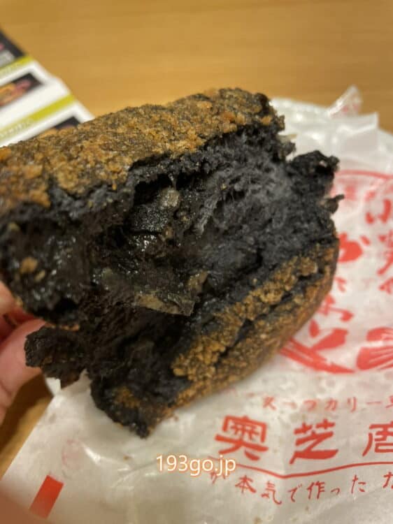 黒い生地の中は黒カレー。コク甘でピリ辛、食べやすい。