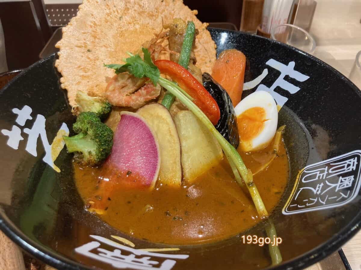 顔を浸けられそうなほど大きな黒い丼に、えびせん一枚、色鮮やかな野菜がスープカレーに浸ってる。丼に店名がデカ文字で印字。奥芝商店!