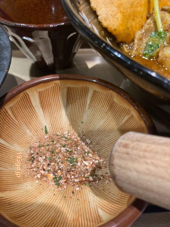 カレーと別盛りのライス、すり鉢ですって食べるふりかけ付き。