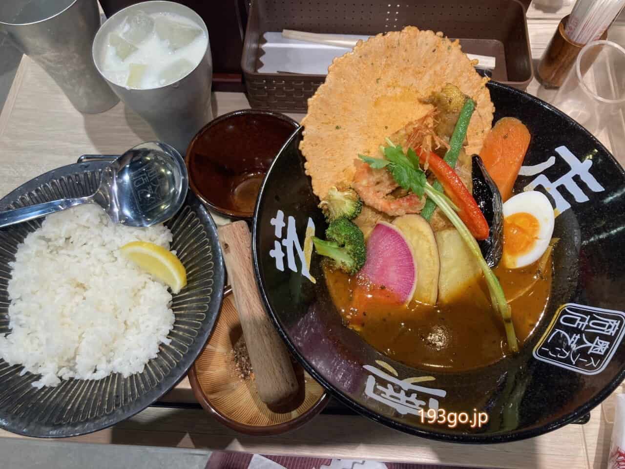 デカ丼にエビセン、野菜ゴロゴロ、チキン一本の海老出汁&スパイシーな鶏あえず足カリー!