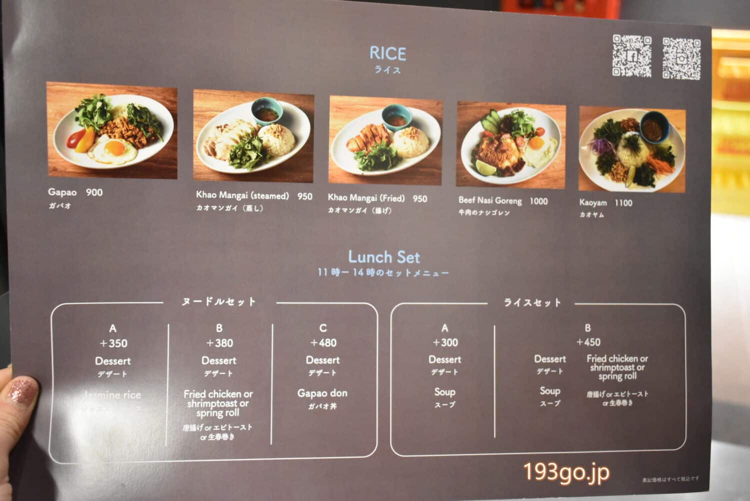 ガパオ、カオマンガイ、ナシゴレンなどのご飯ものも。