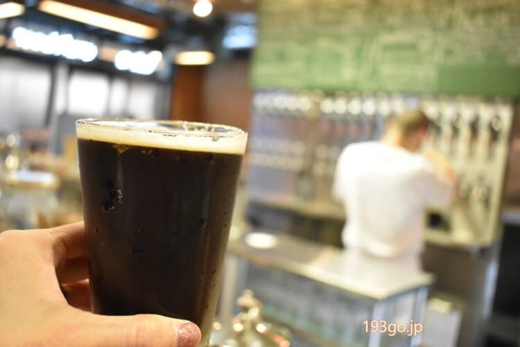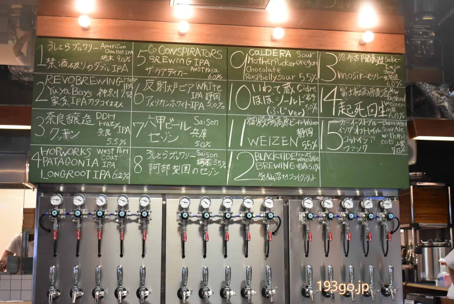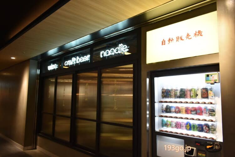 駅通路に面した一角には、打ちっぱなしの壁に水色の店名ロゴ、 缶のクラフトビールを揃えた自動販売機が設置されレトロな雰囲気