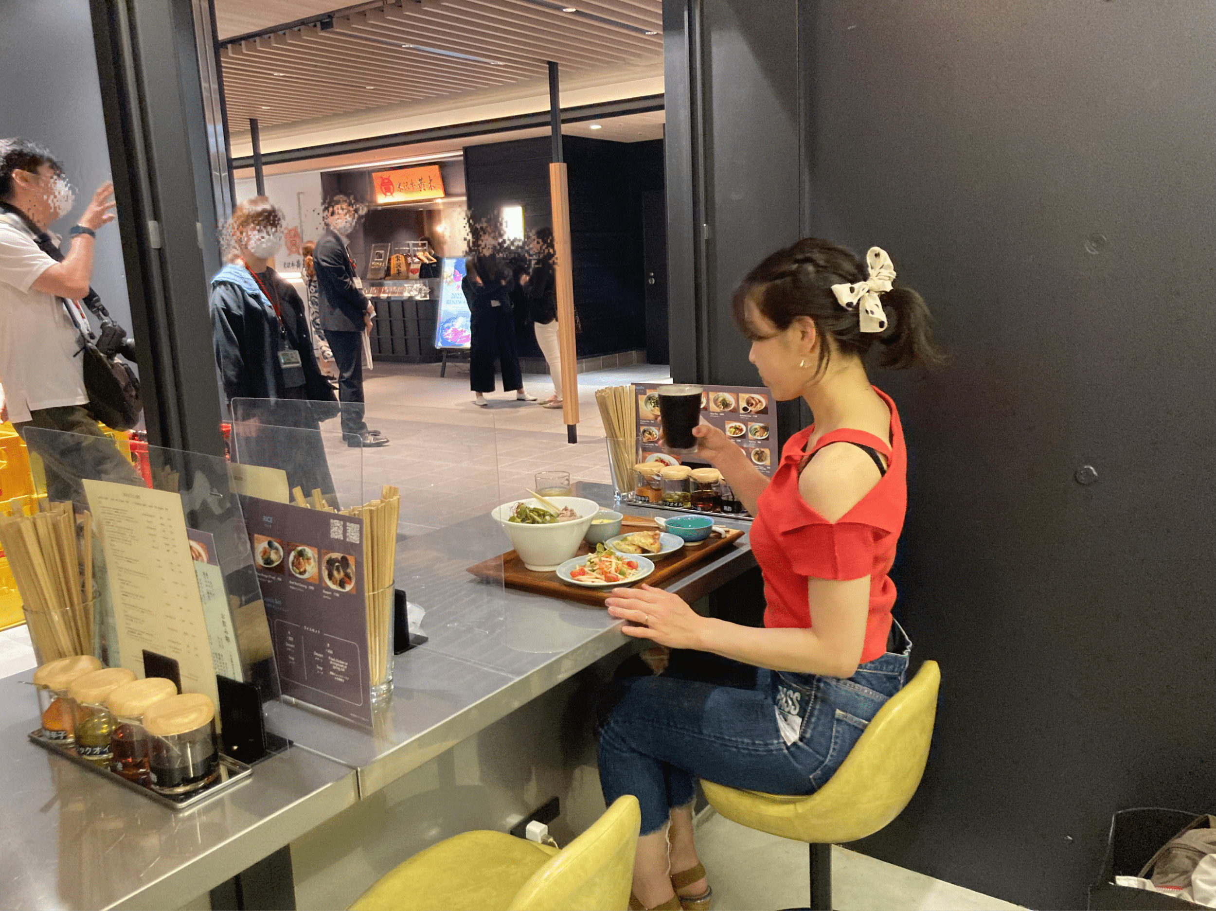 入口は全面ガラス張りで開放感があり、外にもハイチェアのテーブル席がいくつも置かれアジアの屋台雰囲気も出ている。