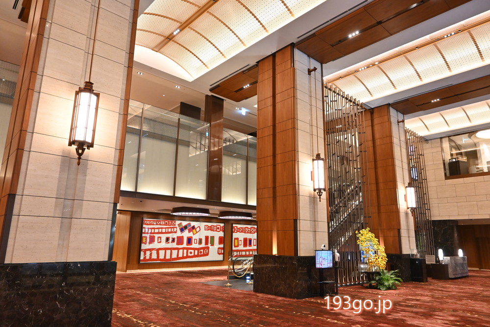 正面エントランスを入ると高い天井に、ワインレッドのじゅうたん、木材やシャンパンゴールド調の気品ある内装。奥に見えるモザイク壁画は、芸術家・猪熊弦一郎の作品。