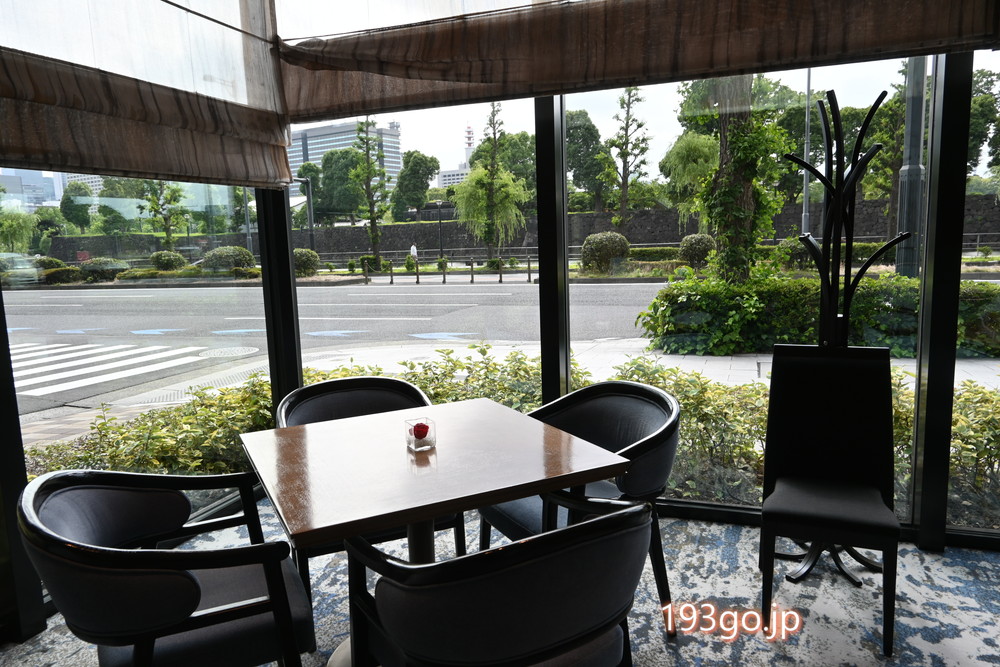 ロッシニテラスの店内に入ると、右手にバーカウンター、正面の窓からは皇居側の景色が望め、席はゆったりと配置され開放感がある。