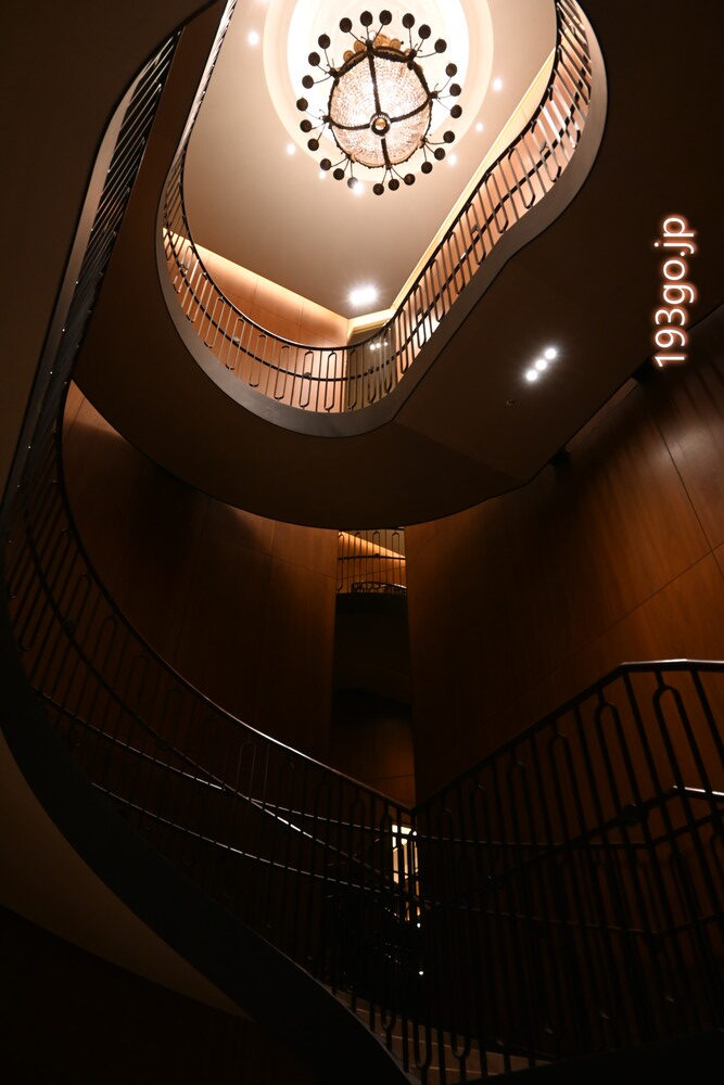 シャンデリアを見上げる豪華ならせん階段は、結婚式の際の撮影も行われるシンボル的存在。
