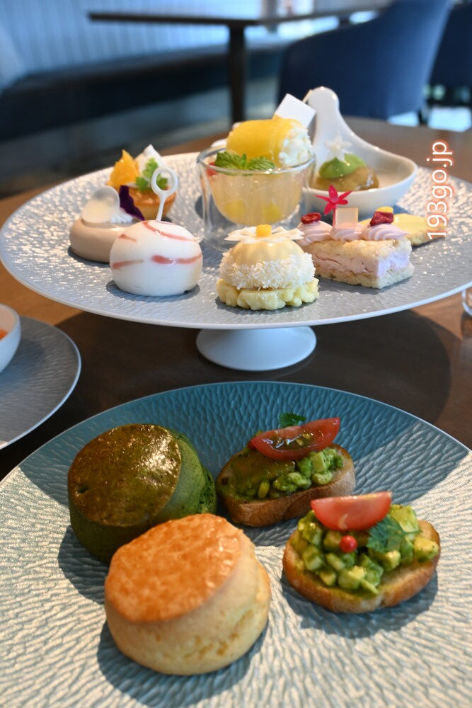 <セット内容>ヨーグルトのムース 夏祭り/カカオフルーツのゼリーとパインのコンポート/パイナップルロール ローストココナッツを添えて/ライチとラズベリーのダコワーズ/パッション・マンゴーのクリームタルト/玄米茶のサヴァラン 抹茶クリーム/トンカ豆とオレンジのマドレーヌ/ミルクチョコレートムース/フォワ・グラ入りトウモロコシのブルテ/スモークサーモンとアボカドのオープンサンド/フロマージュブラン マンゴー風味/スコーン 2 種 (プレーン・抹茶)/フルーツジャム/クロテッドクリーム