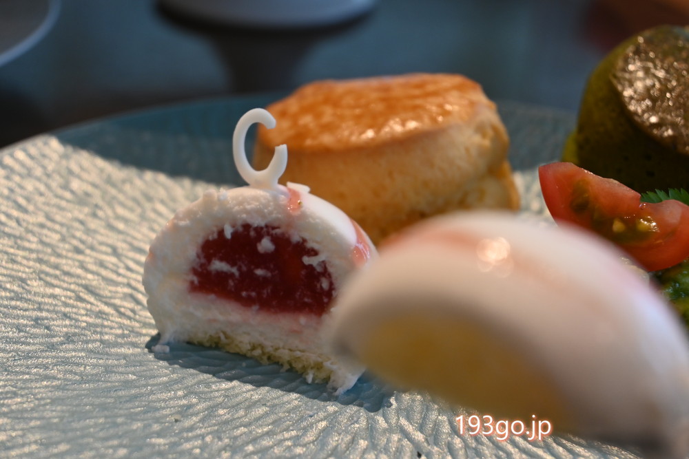 メインのプレートにはパイナップルやパッションフルーツ、マンゴー、ライチなどの南国フルーツをふんだんに使ったスイーツの他、バローナのミルクチョコレートムースやフォワ・グラ入りトウモロコシのブルテが盛り合わせに。