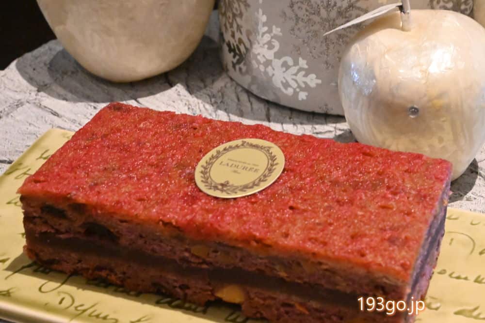 自家製セミドライとちおとめ、クランベリー、いちじくを苺のリキュールに漬け、マジパン、3種のナッツを生地に配合。