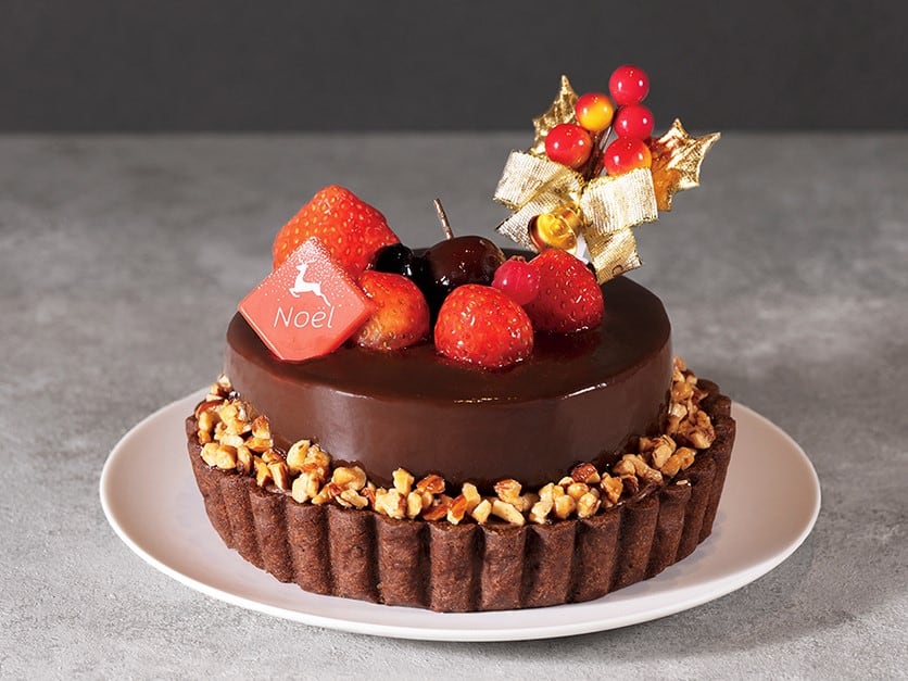 チョコレートが醸し出す豊かな風味と口溶け、みずみずしいフルーツの爽やかな甘みをいっしょに堪能したい方におすすめのタルト。シックなオーナメントやプレートがクリスマス気分を盛り上げてくれる。