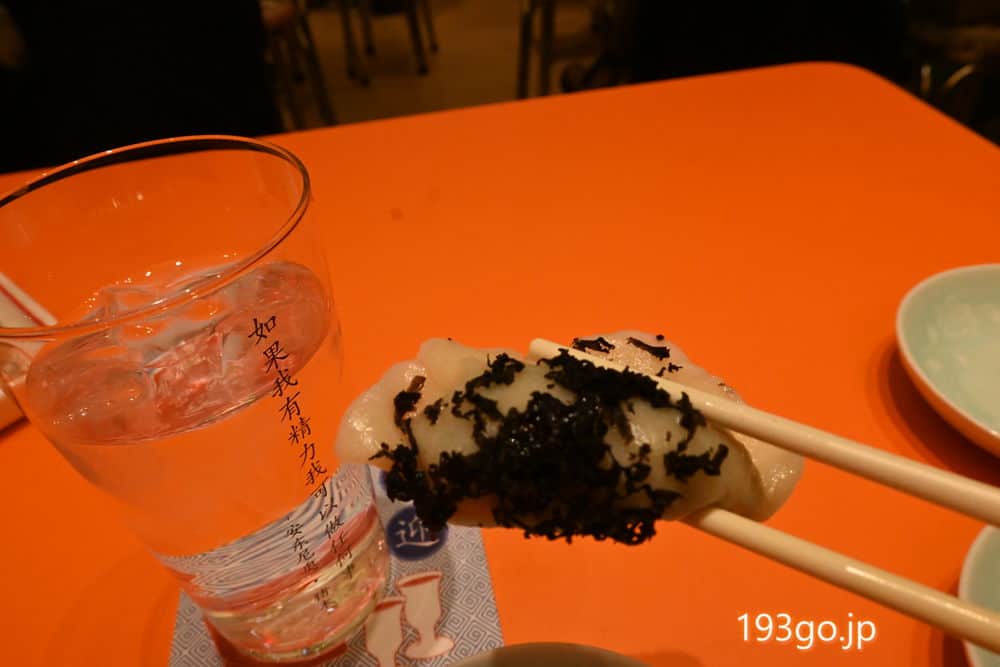 水餃子の皮はツルっと、餡はスープ風で、タレなど付けずそのまま。ジュワ~っと旨みが広がる。