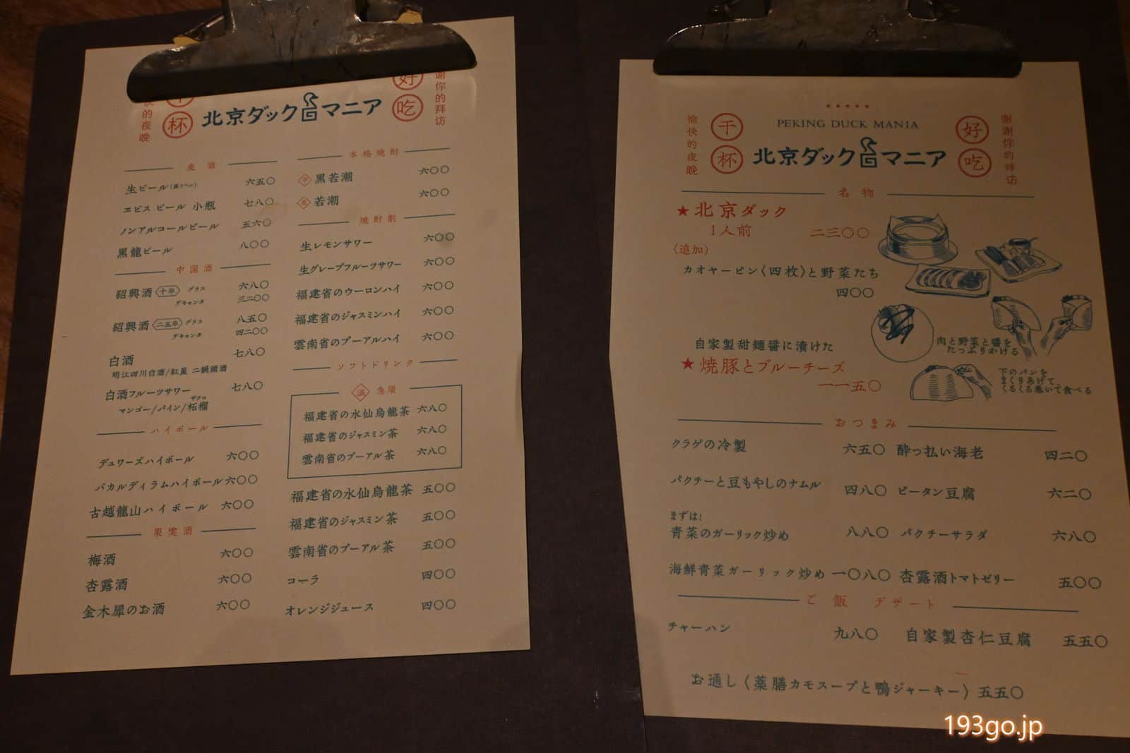 メニューは名物の北京ダックを始め、おつまみ、炒め物、ご飯もの、デザート。
