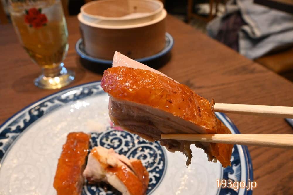 鴨の皮とモモ肉、胸肉をネギやキュウリ、自家製の甜面醤と共にカオヤーピンという皮に包みパクリ。