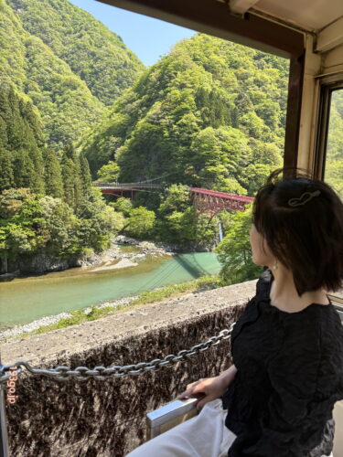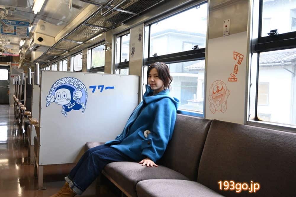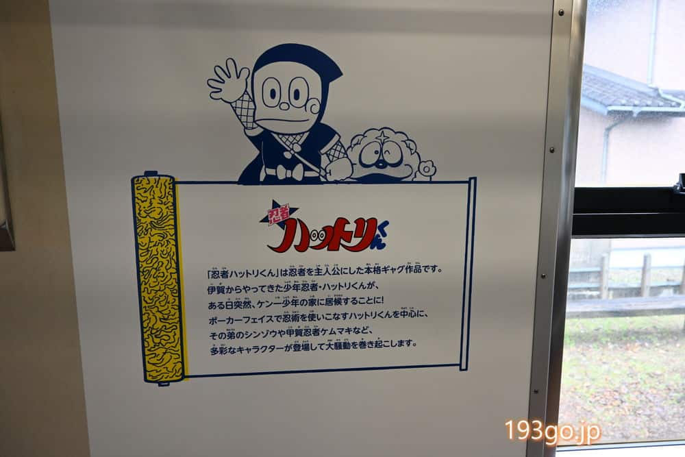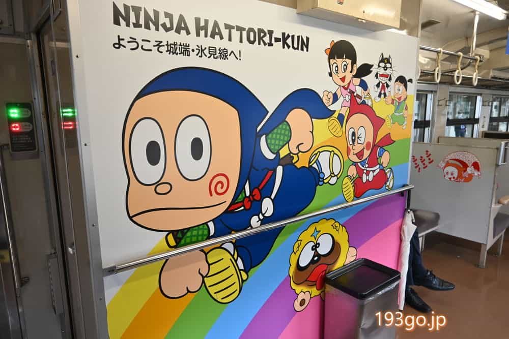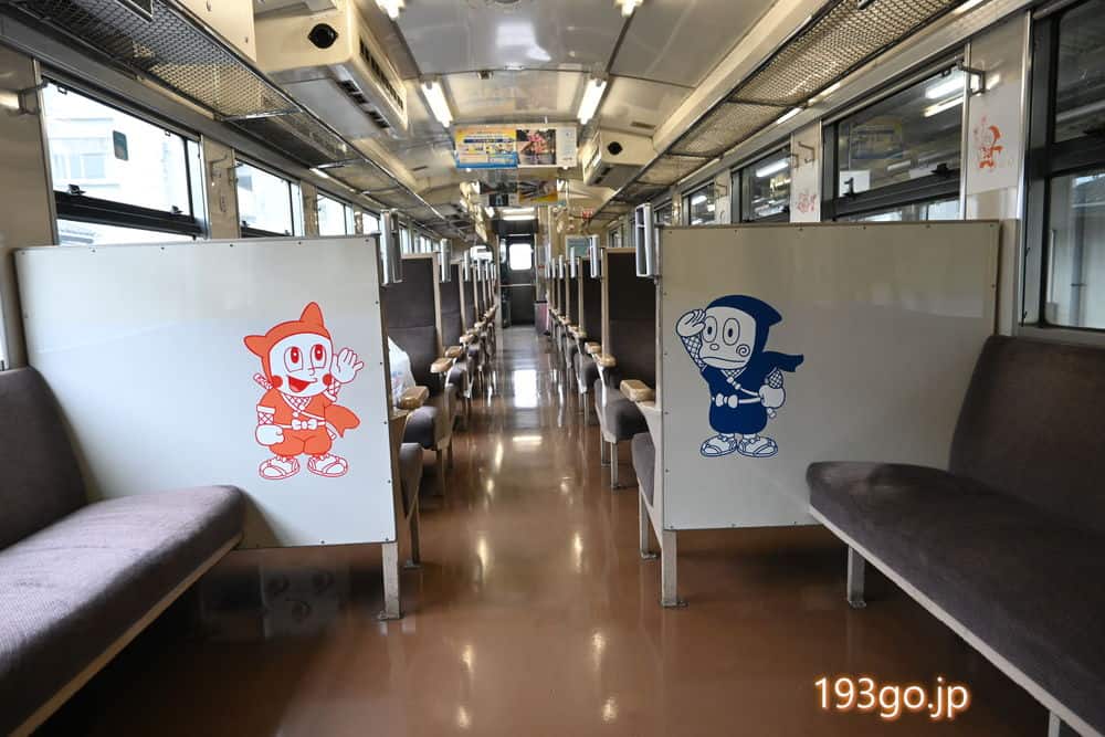 ラッピングの車内にも「忍者ハットリくん」のキャラクターが描かれ、車内アナウンスにはハットリくんも登場した。ござる口調の観光案内を聴きながら暫しの列車の旅を満喫。