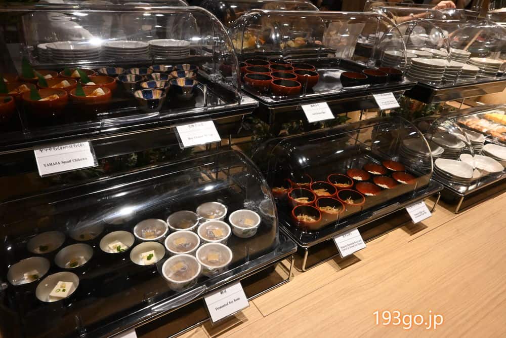 和食は焼き魚や玉子焼きの他、温泉卵、冷奴、ヤマサのちくわなどの小鉢が並ぶ。