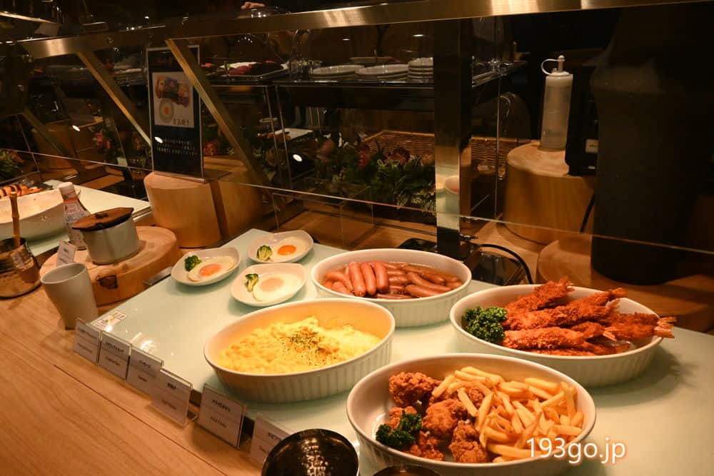 ビュッフェ台に、サラダ、フルーツ、ヨーグルト、パン、ケーキ、海老フライ、唐揚げ、ウインナー、スクラブルエッグ。