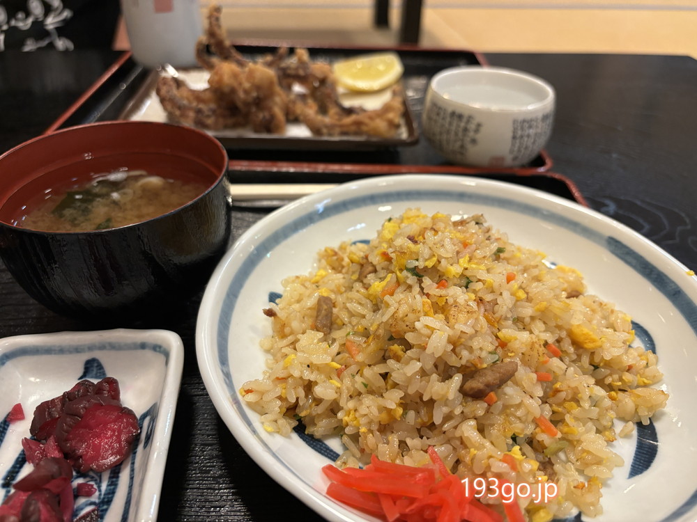 一番人気と書かれてる月待ち温玉うどんと、炒飯、イカゲソ唐揚げをチョイス。