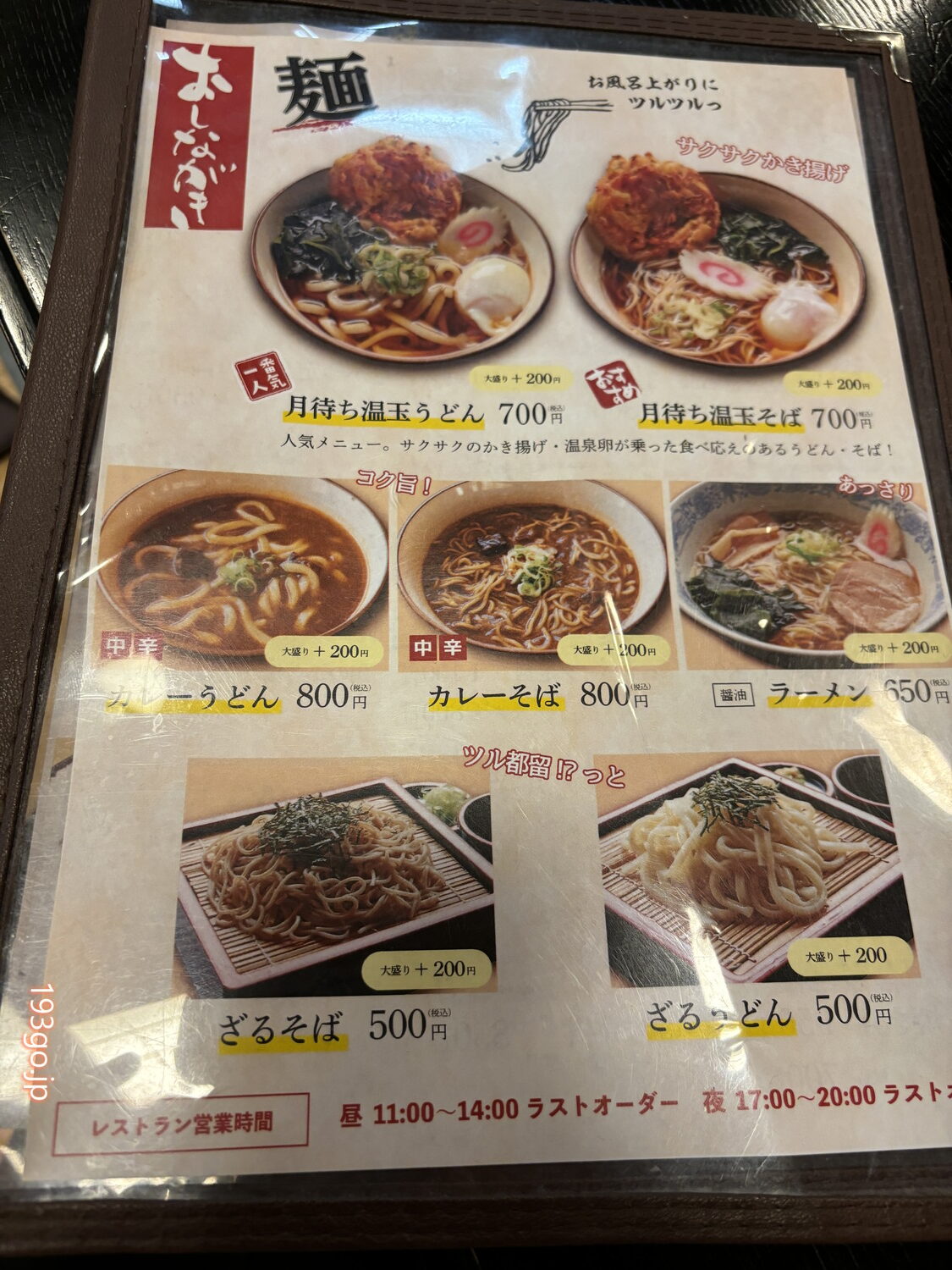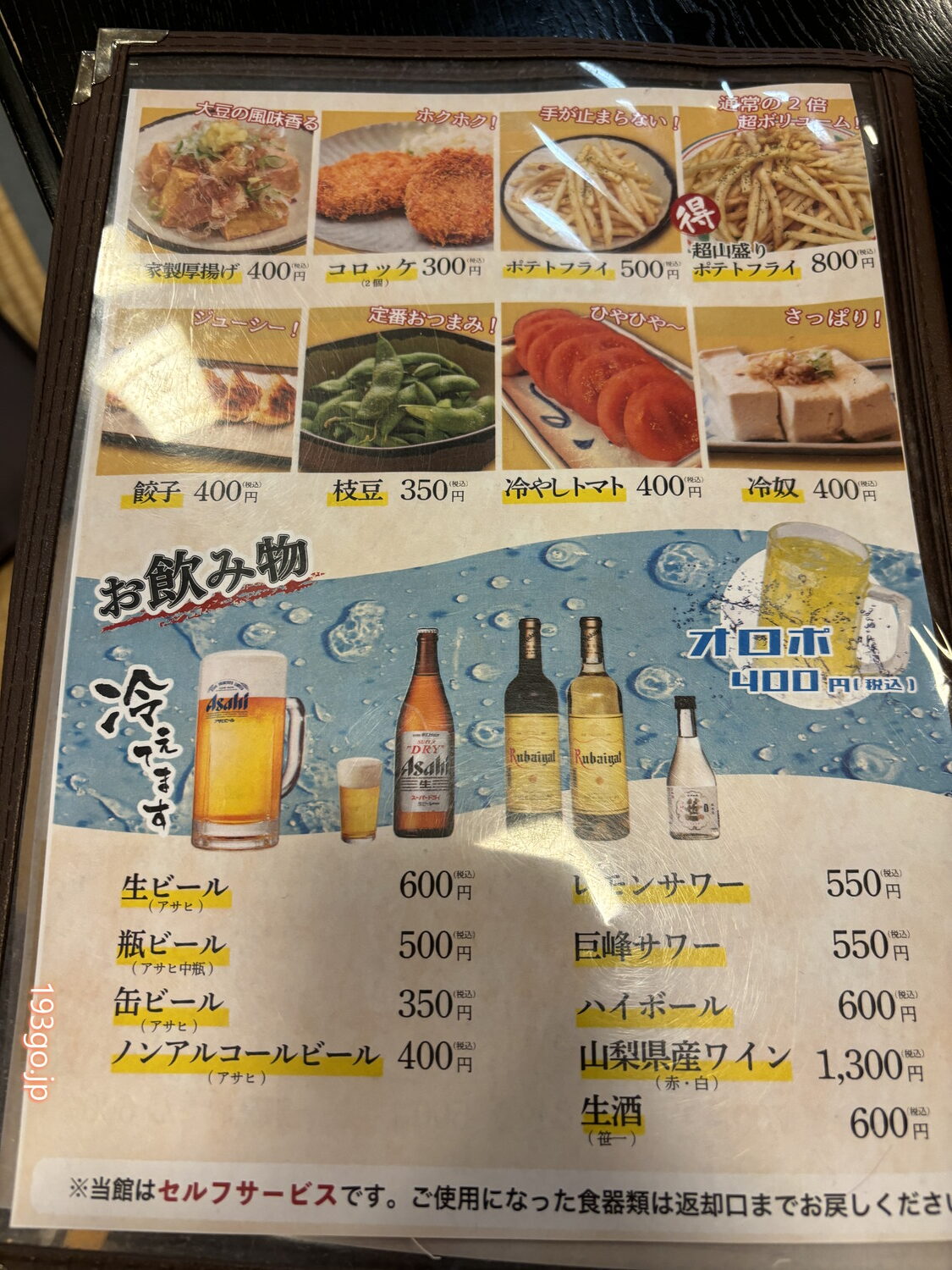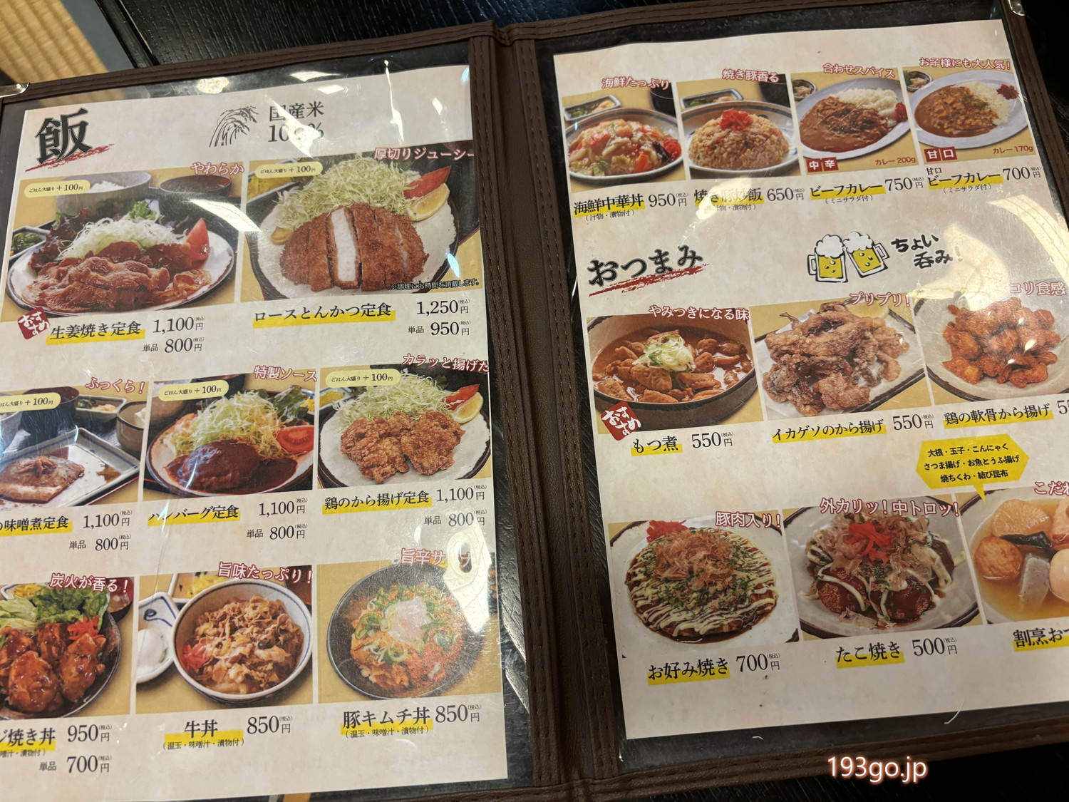 うどん、そば、ラーメン、トンカツ、生姜焼き、ハンバーグ定食の他、たこ焼きやフライドポテト、冷奴などのおつまみ系。