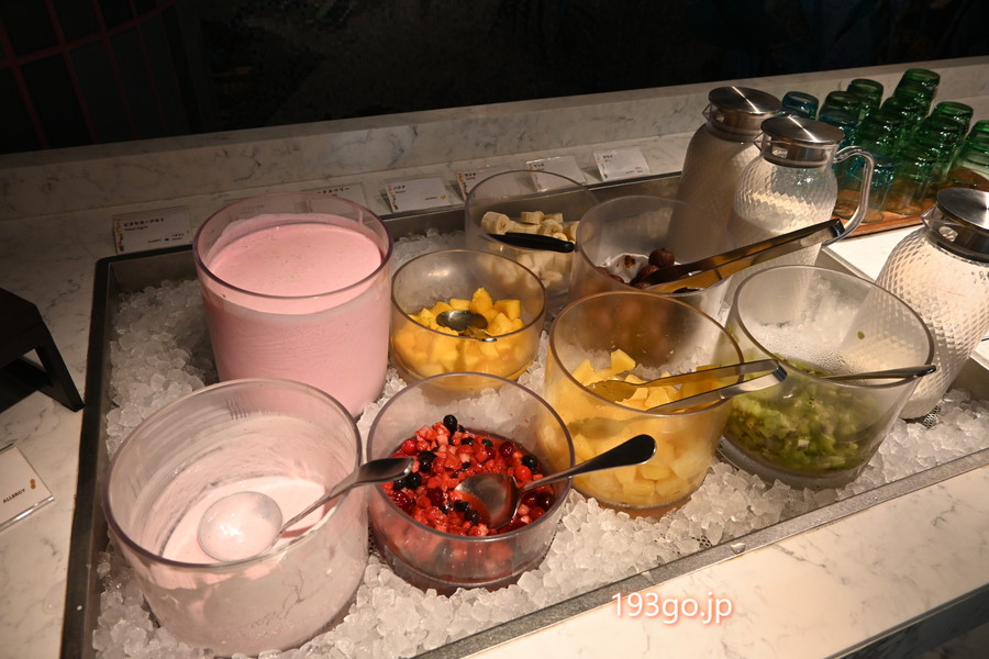 トロピカルなフルーツとヨーグルト、サラダのドレッシングもタンカンやシークァーサー、バルサミコ酢にオリーブオイルなど種類豊富。好みに盛り付けて楽しめた。
