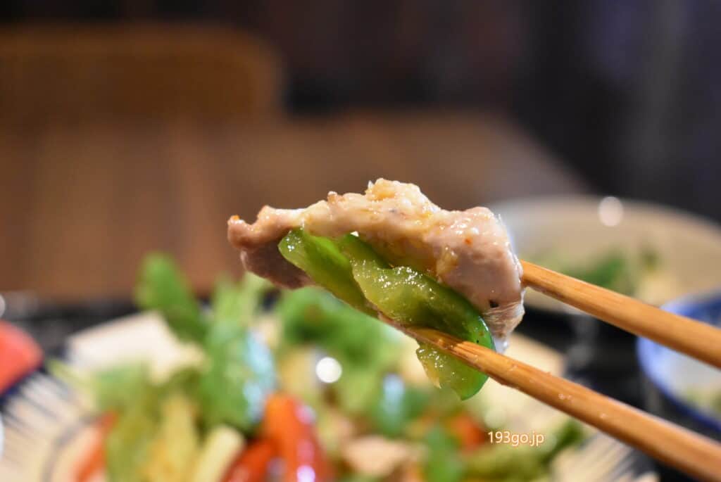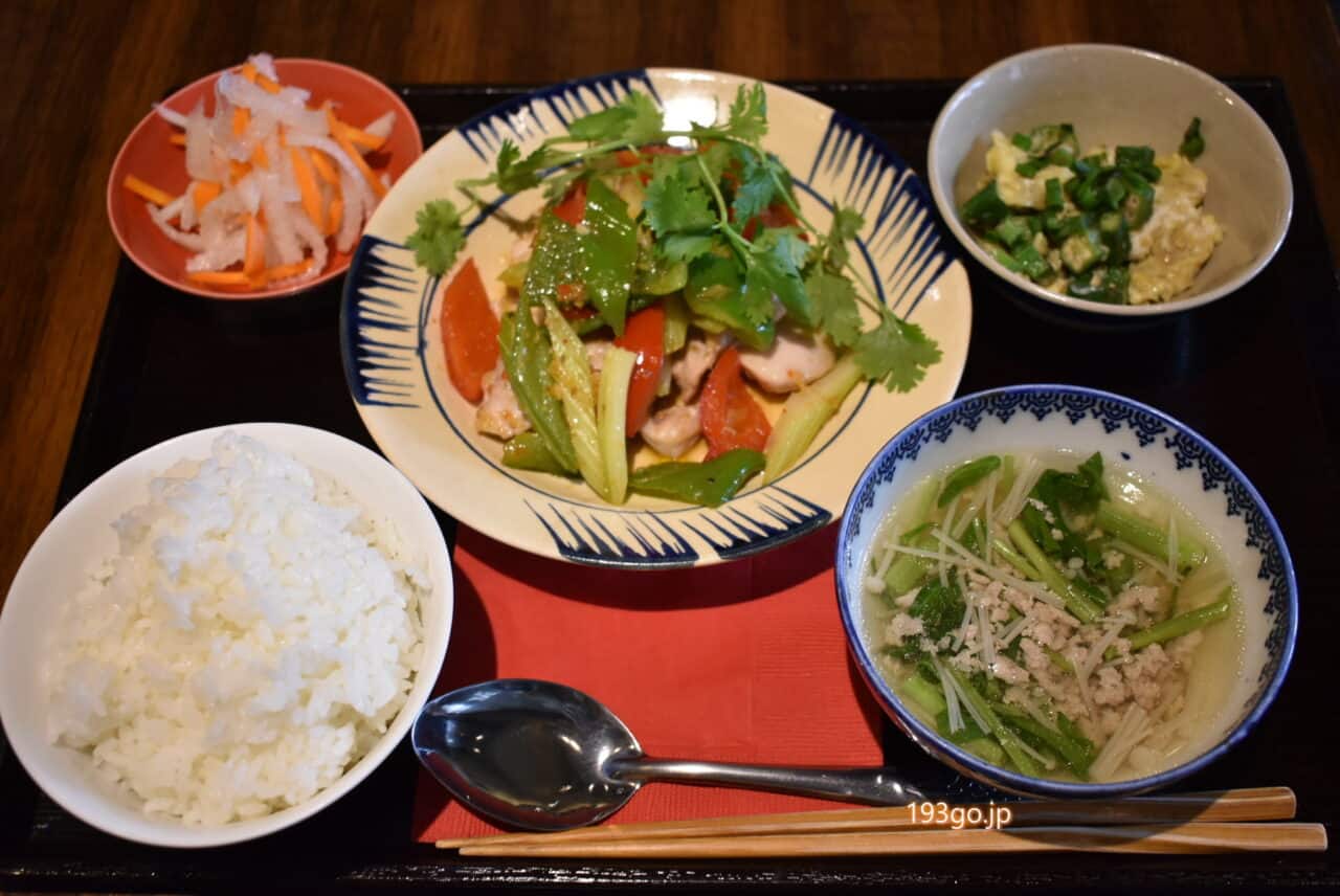 ピーマンやセロリのサクサク、パクチーが香り、ご飯も進む味付け。