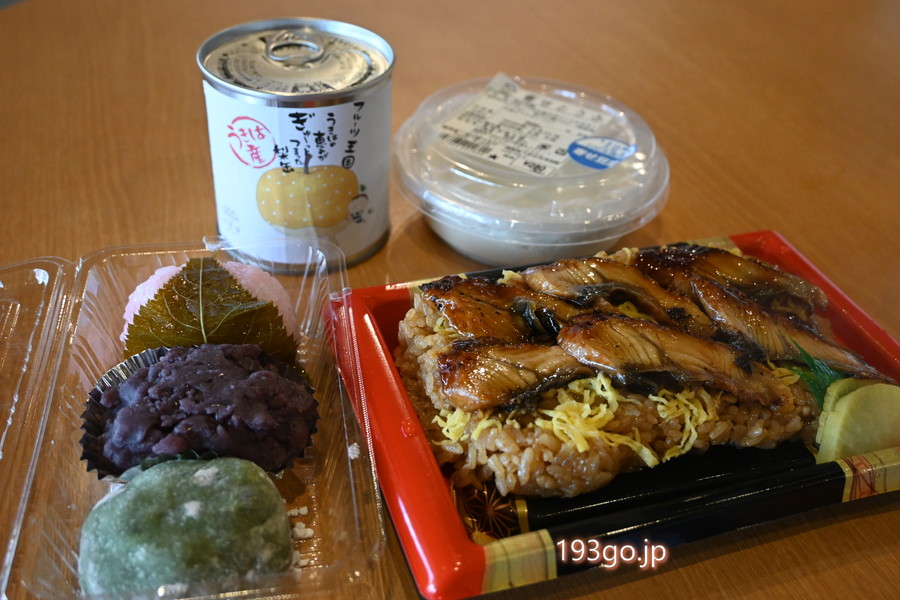 鰻弁当と3色団子、お豆腐を選んで、休憩所でイートイン。