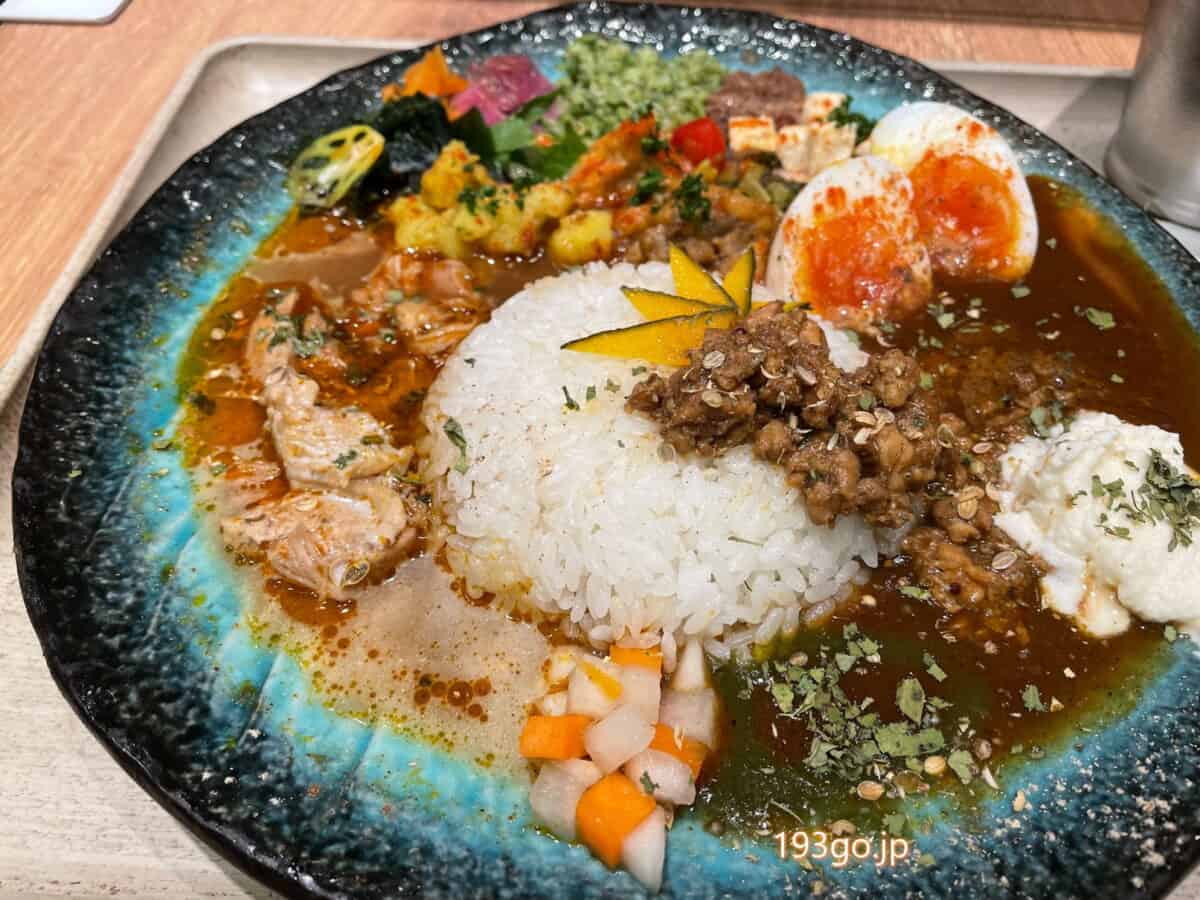 2種類のカレーは出汁がチキンと魚介とで異なるので2つ味わうと楽しい。
