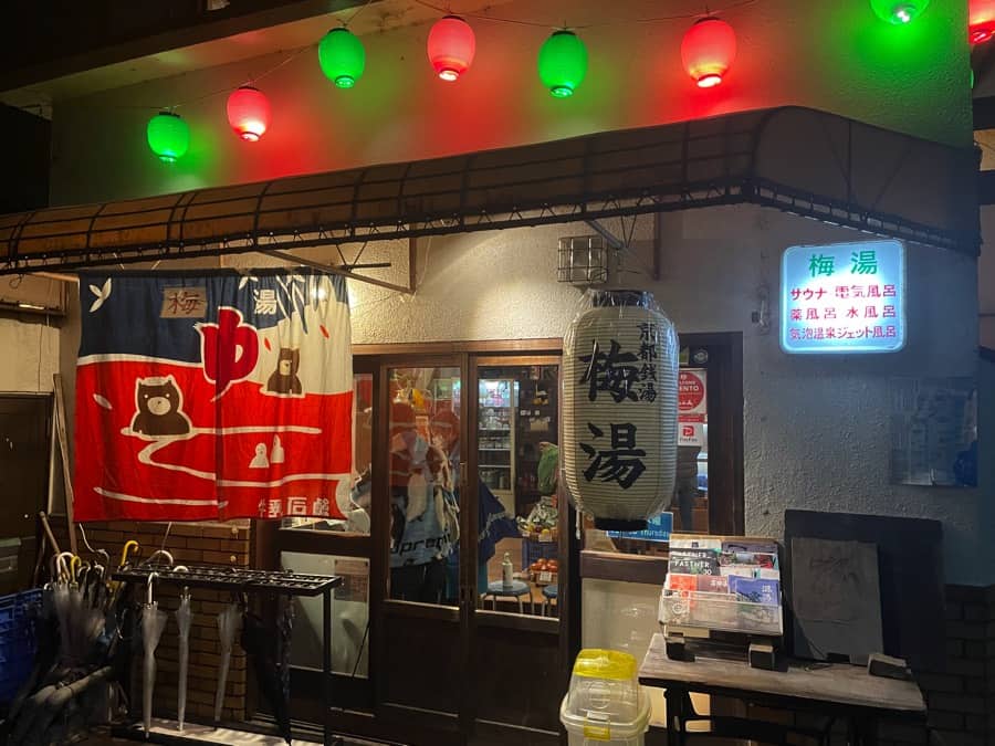 夜は「サウナの梅湯」がカラフルなネオンで可愛い。