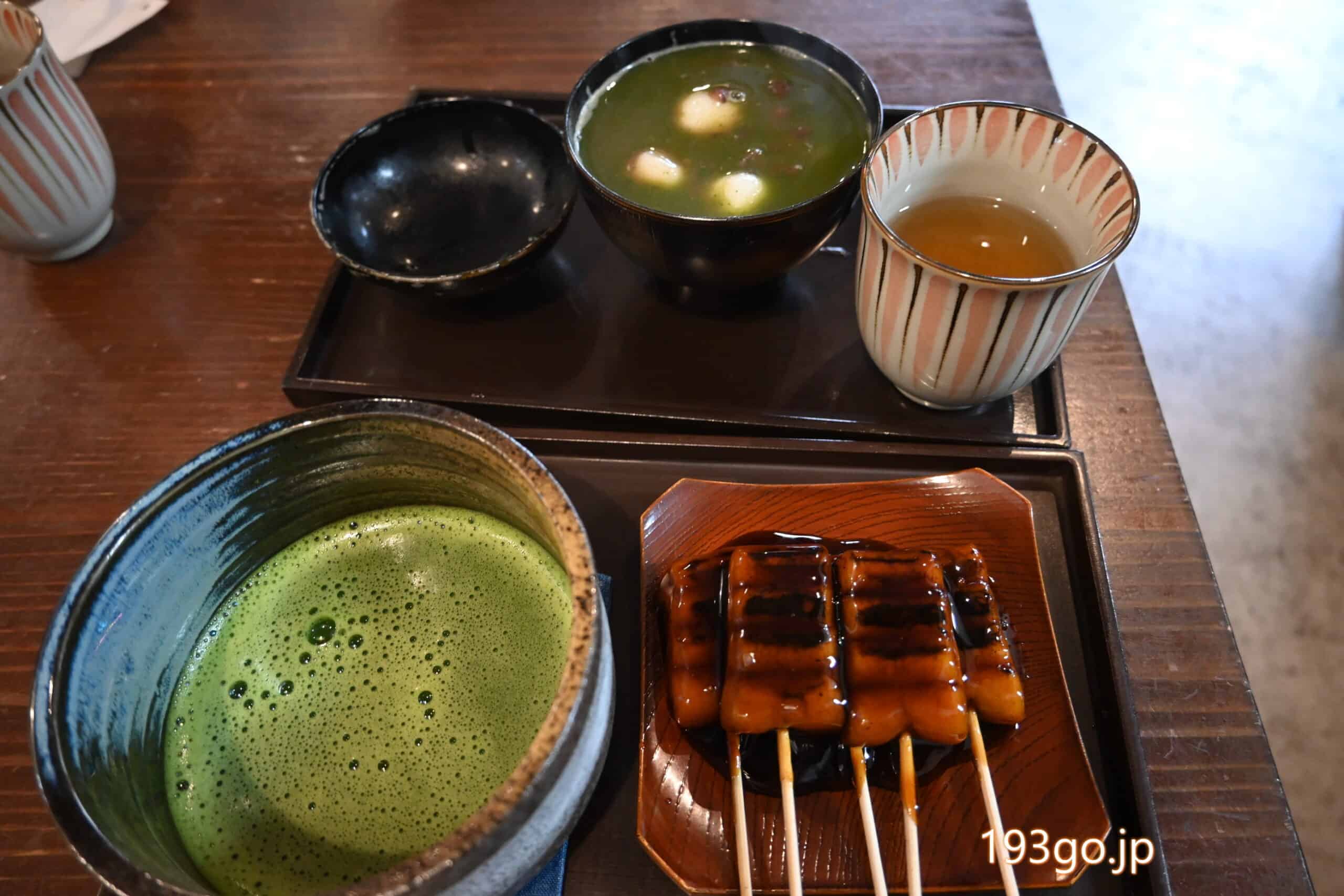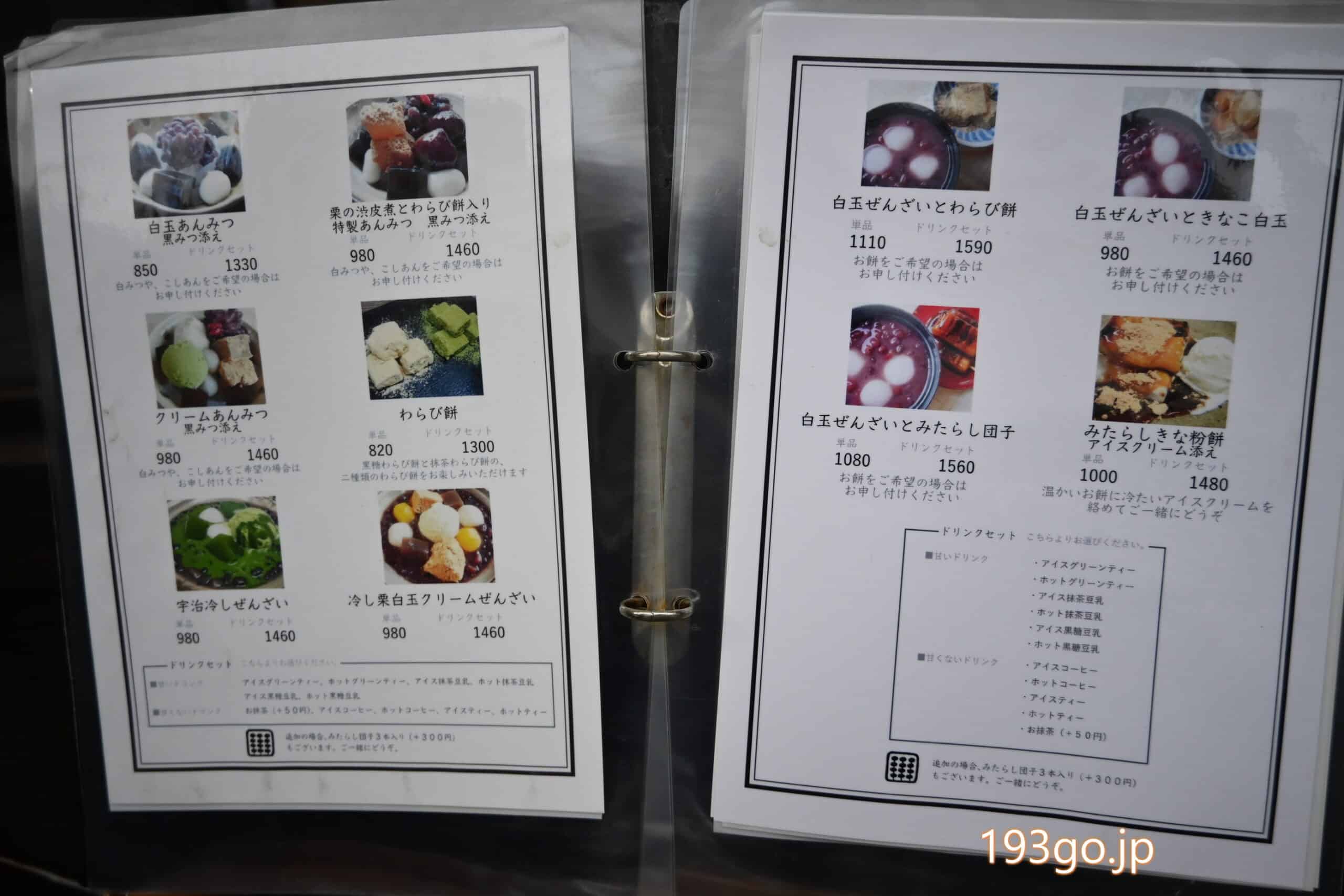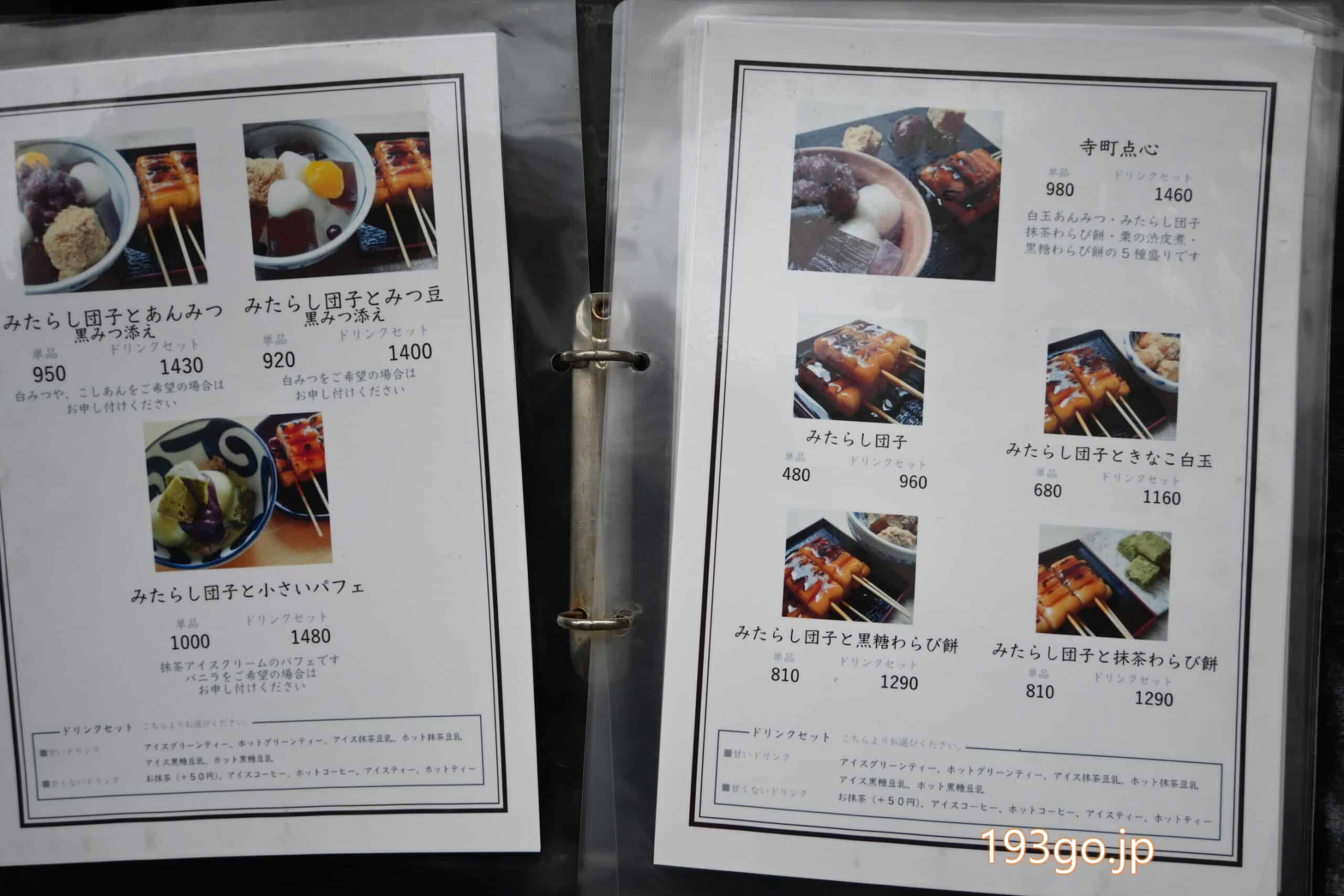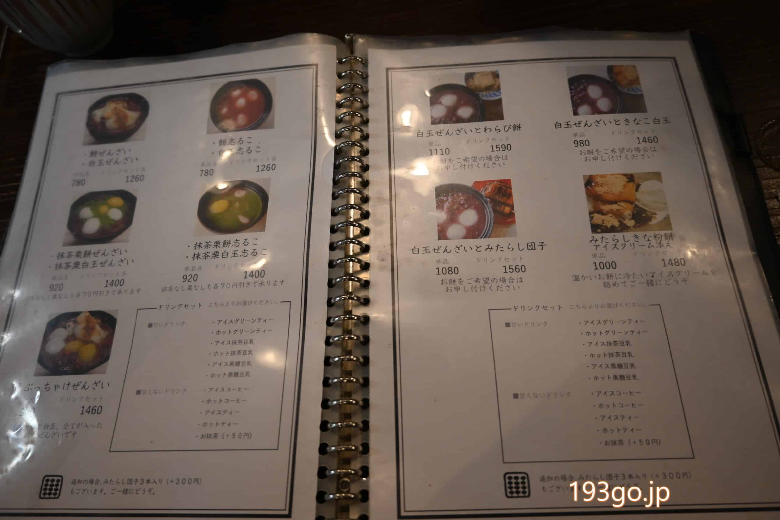 など、みたらし団子単品や、きなこ白玉や、わらび餅とのセット、更に、おしるこ、ぜんざいとある。