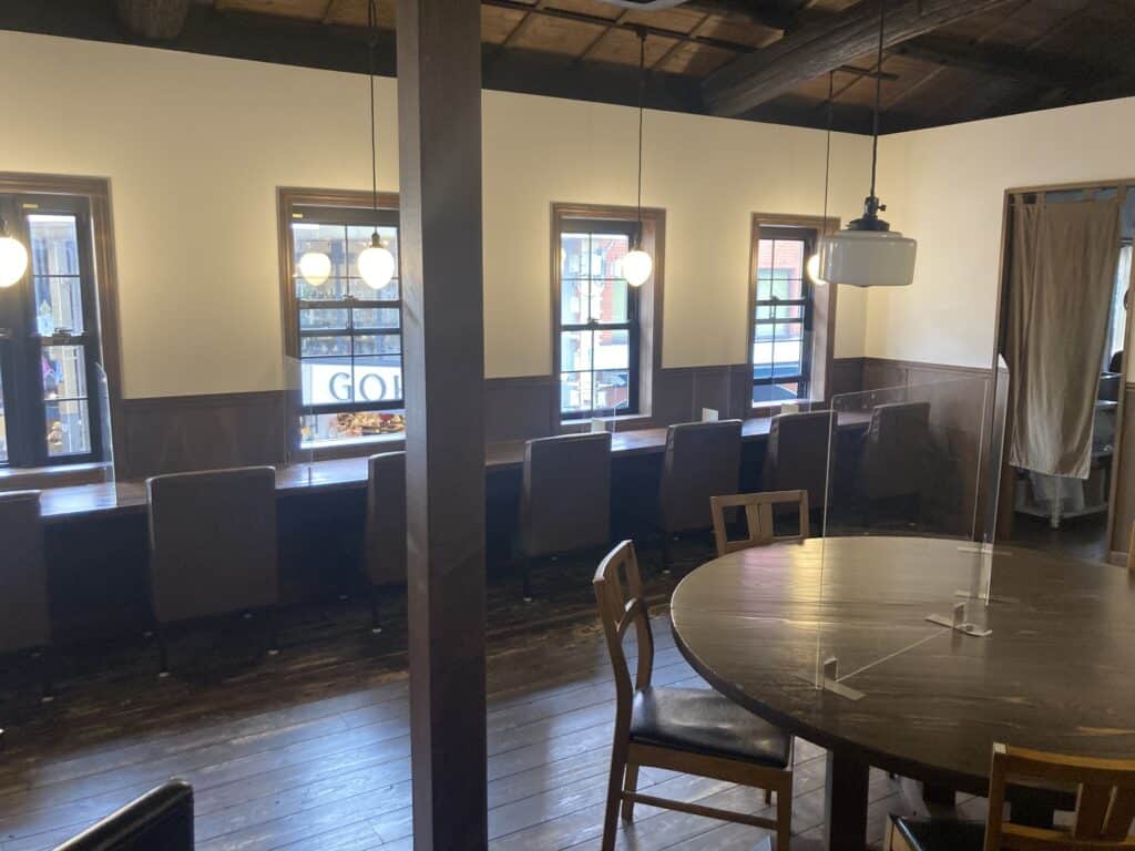 1階は天井が高く落ち着いた雰囲気。2階の窓辺では町並みを眺められる。