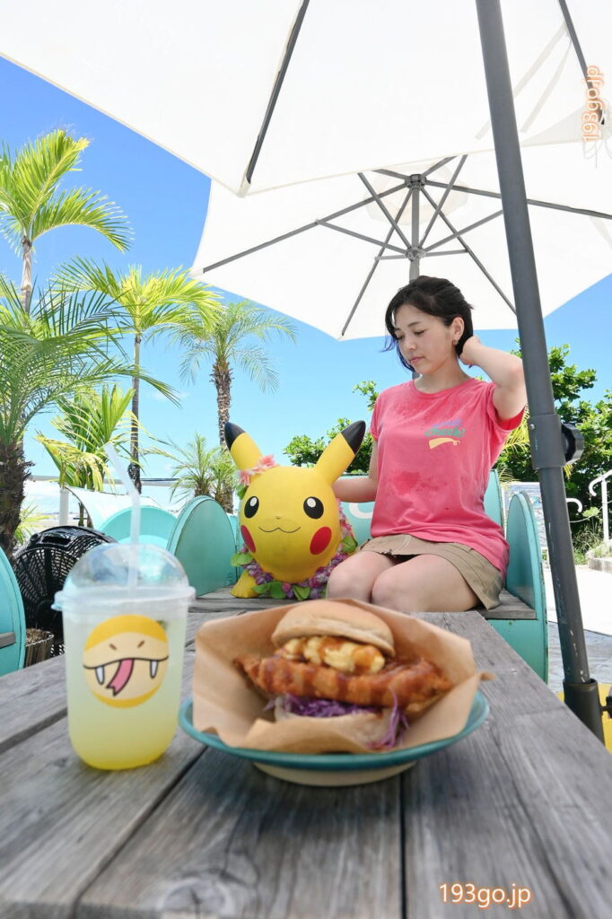 イートイン可能。外にはピカチュウのオブジェが置かれた水色のリゾート感たっぷりの席も。