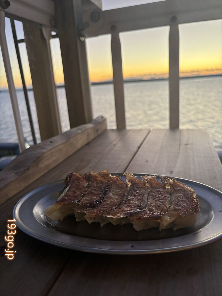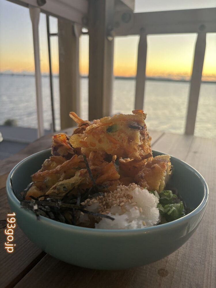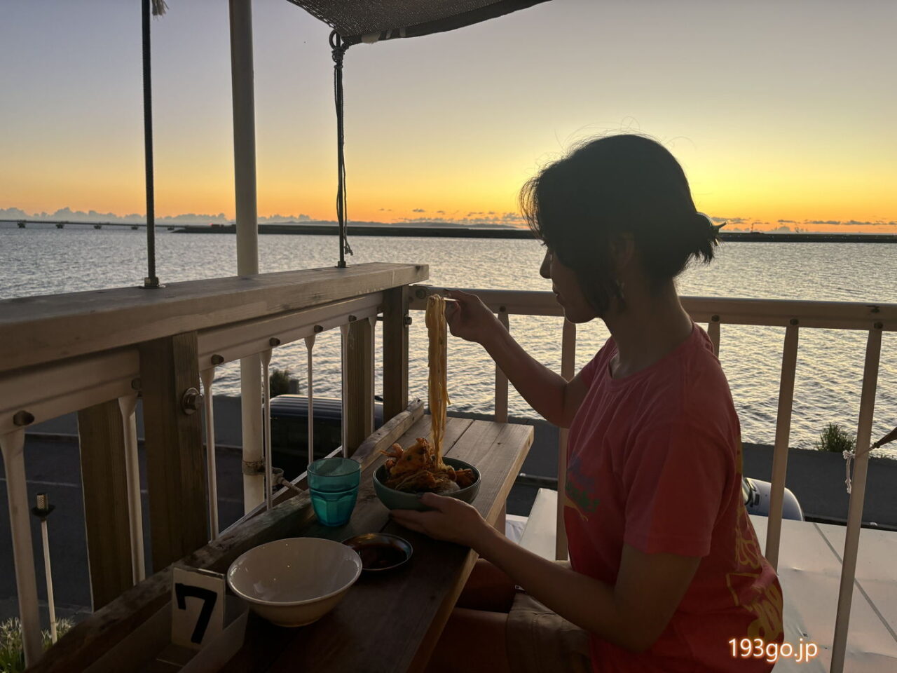 ウミカジテラスならではの高台のロケーションで夕暮れのサンセットに照らされながら味わう冷やし沖縄そばは格別…!