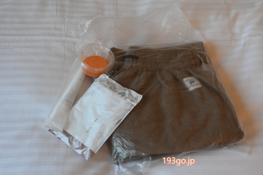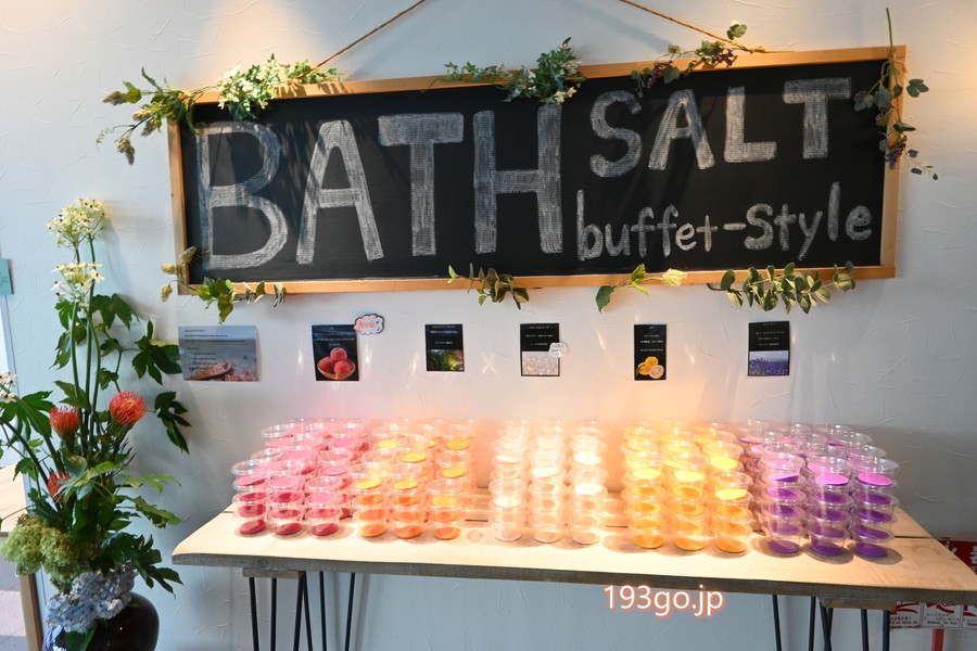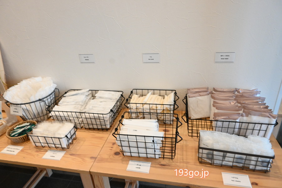 ロビーにはドリンクサービスやバスソルトバイキング、アメニティのセルフチョイスが用意され、