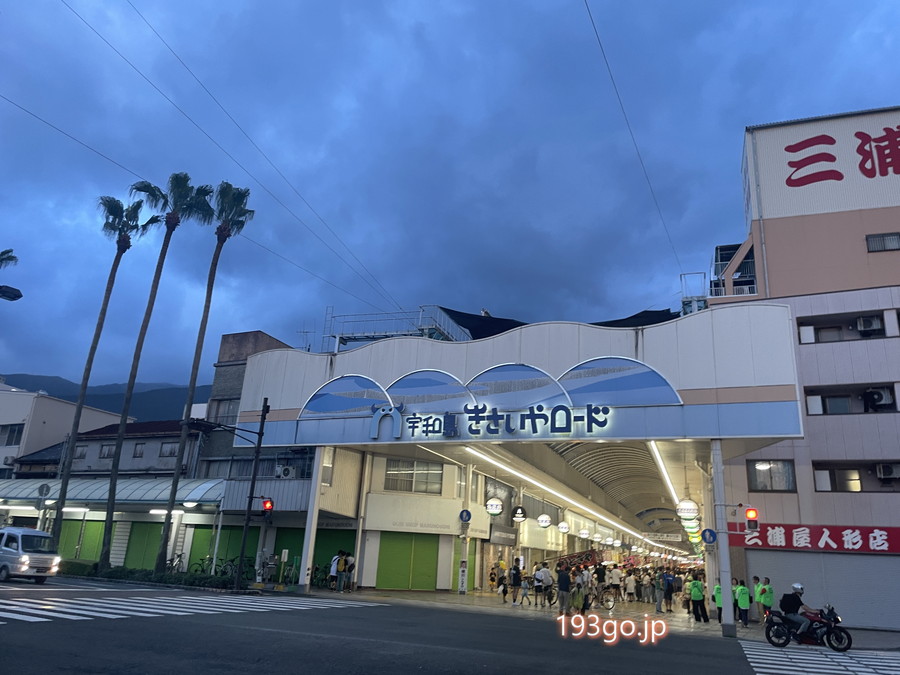 到着した夕方には、ちょうど和霊神社で夏祭りの儀式が行われていて、アーケード商店街では夜市も開催。
