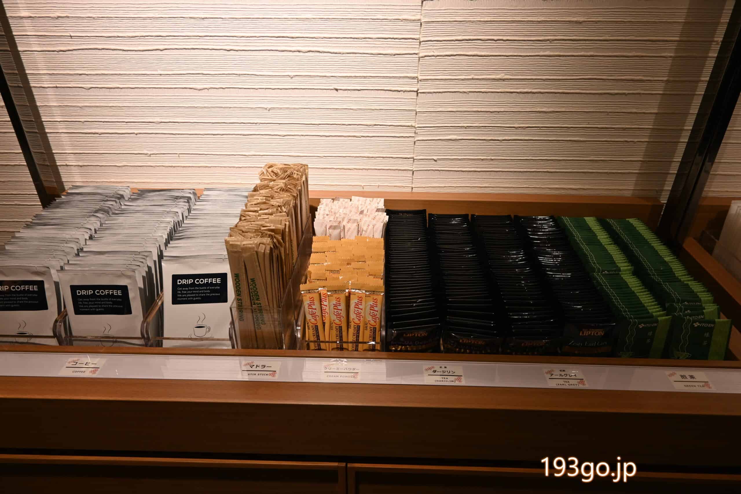 ティーバッグやコーヒー、ヘアゴム、歯ブラシ、コットン&綿棒、ボディタオルなど必要なアメニティもここから調達。