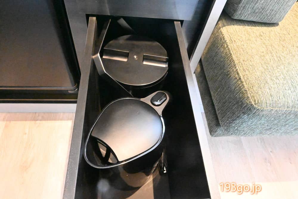 ネスプレッソマシンに、紅茶、ホットチョコレート。引き出しにポット、カップ、グラス、