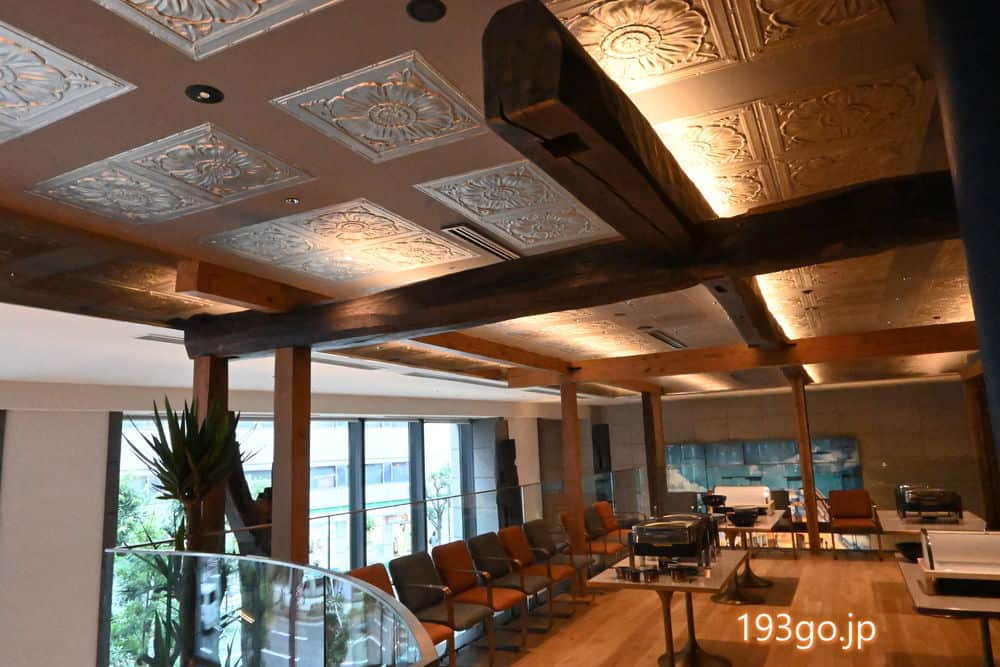 ロビーエリアの木組みの構造体は、京町堀の歴史の象徴的なアイコンである「蔵」に着想を得てデザインされ、2階天井にはブリキのデザインが。