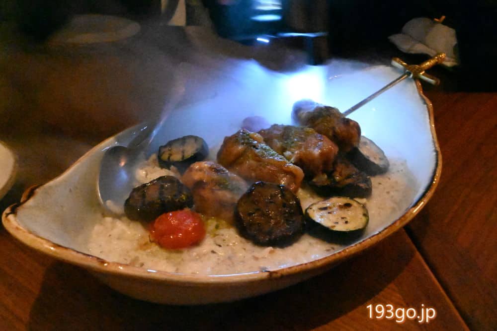voco大阪セントラルのシグネチャーメニュー「“焚火の宴卓” NZ 産仔羊のラム ラック7種のソース」(税サ込 7,000 円)のほか、大阪の郷土料理である「串揚げ」と、シェフの出身地である南イタリア・プーリアの豚肉料理を融合した「”ボンベッテ” トリュフリゾット」(税サ込 4,800 円)、