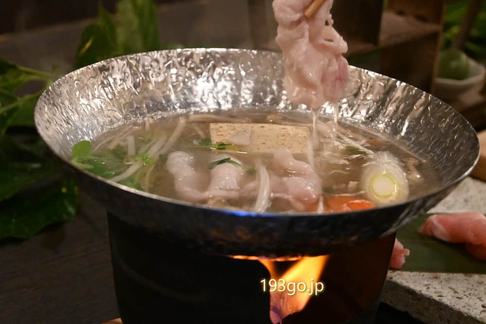 ポークはアツアツの出汁にユラユラ~しっとり甘みがあり、和薬草特製の味噌をつけて味変も!