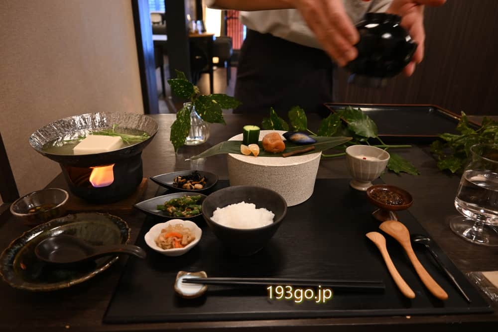 朝食は湯豆腐とお粥、生姜入りの具だくさん汁。
